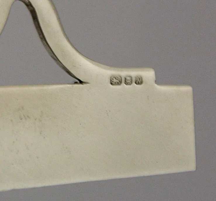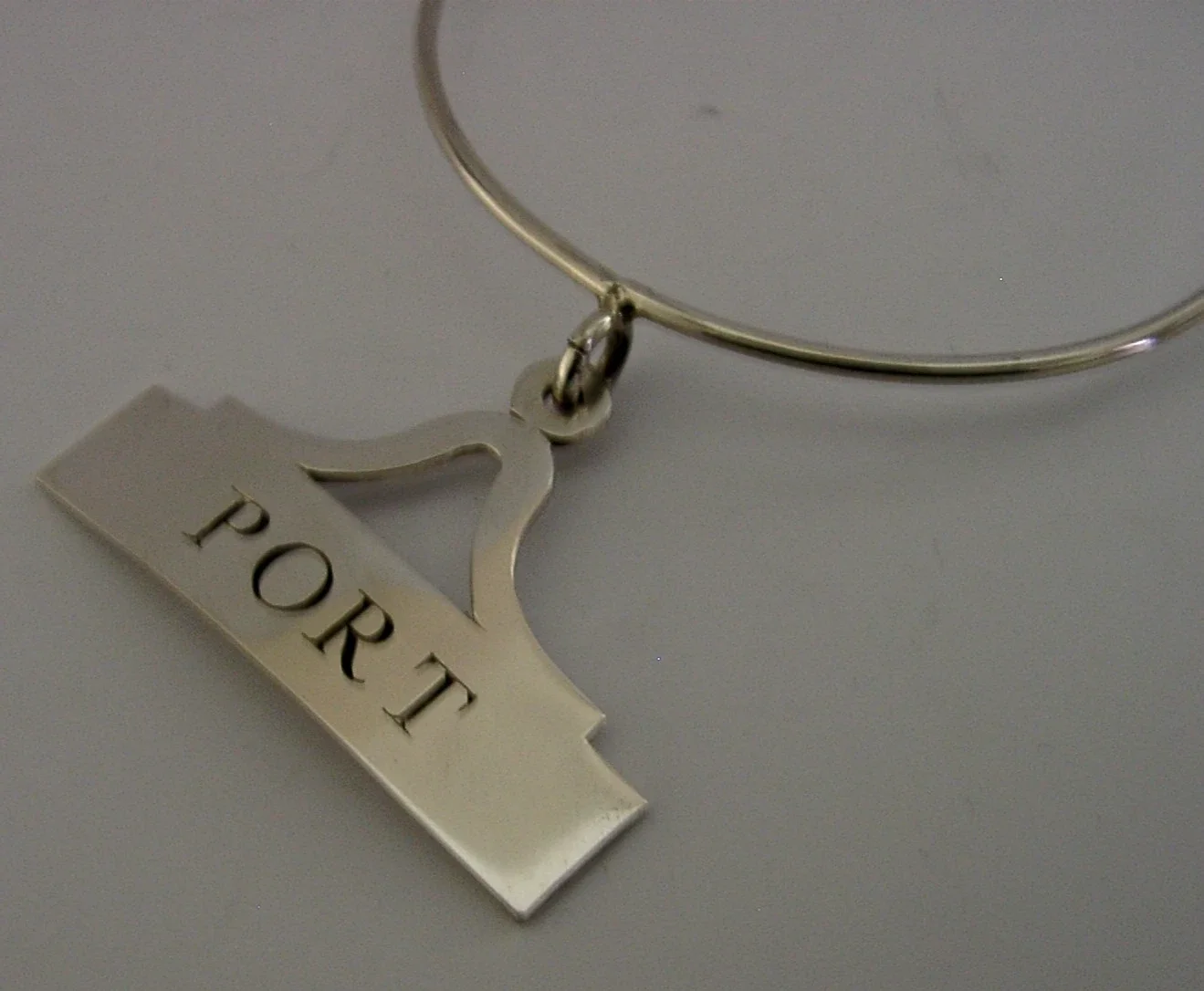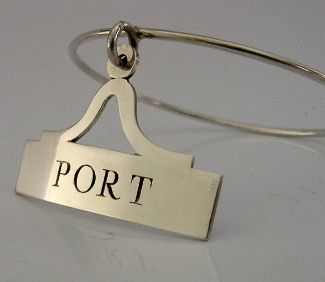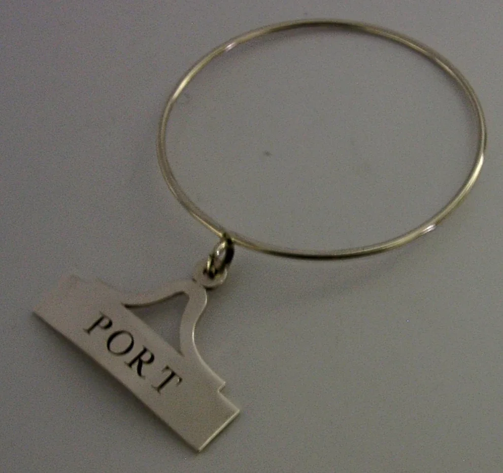 A very nice quality unusual English solid sterling silver Port bottle or decanter collar/label. It is hallmarked for London 1987 with the maker’s marks being SJB of Lewes. It has been well made and is in superb condition being free from dings splits and repairs, note the loop goes around the bottle or decanter - this is also silver. The label measures approx. 2 inches (4.8cms) across and the loop measures 2.75 inches across and combined they weigh 15 grams. A very nicely made clean piece.