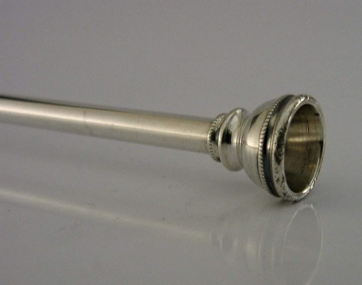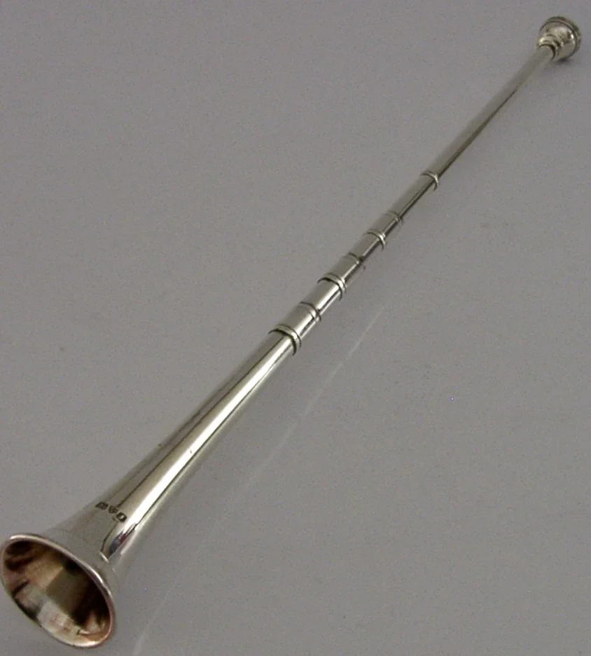 A rare English solid sterling silver fox hunting horn. It is hallmarked for Chester 1910 with the makers marks being Sampson Mordan. It has been superbly made and is in super condition being free from dings splits and repairs - just a tiny mark see final photo. It looks like the inside was once rose gilded but this has all but gone. It measures approx. 12 inches (30.4cm) long by 1.25 inches wide and weighs 45 grams. A rare piece.
