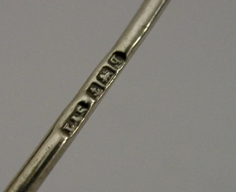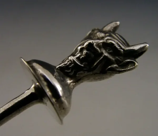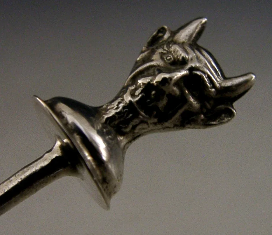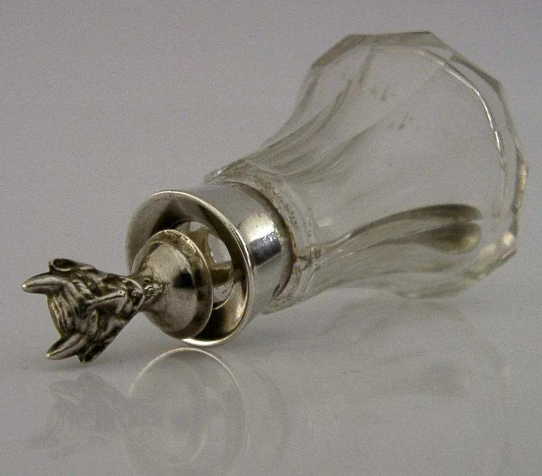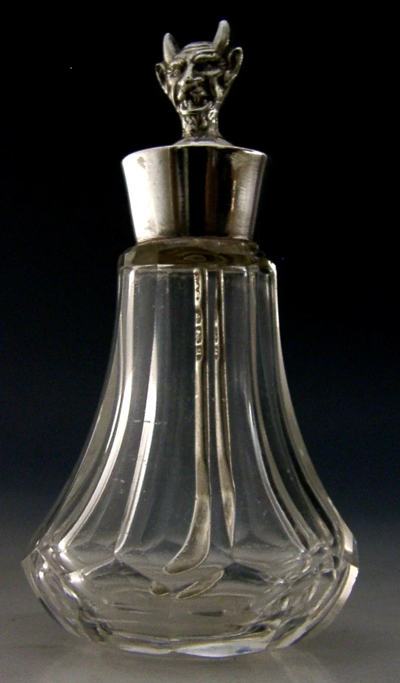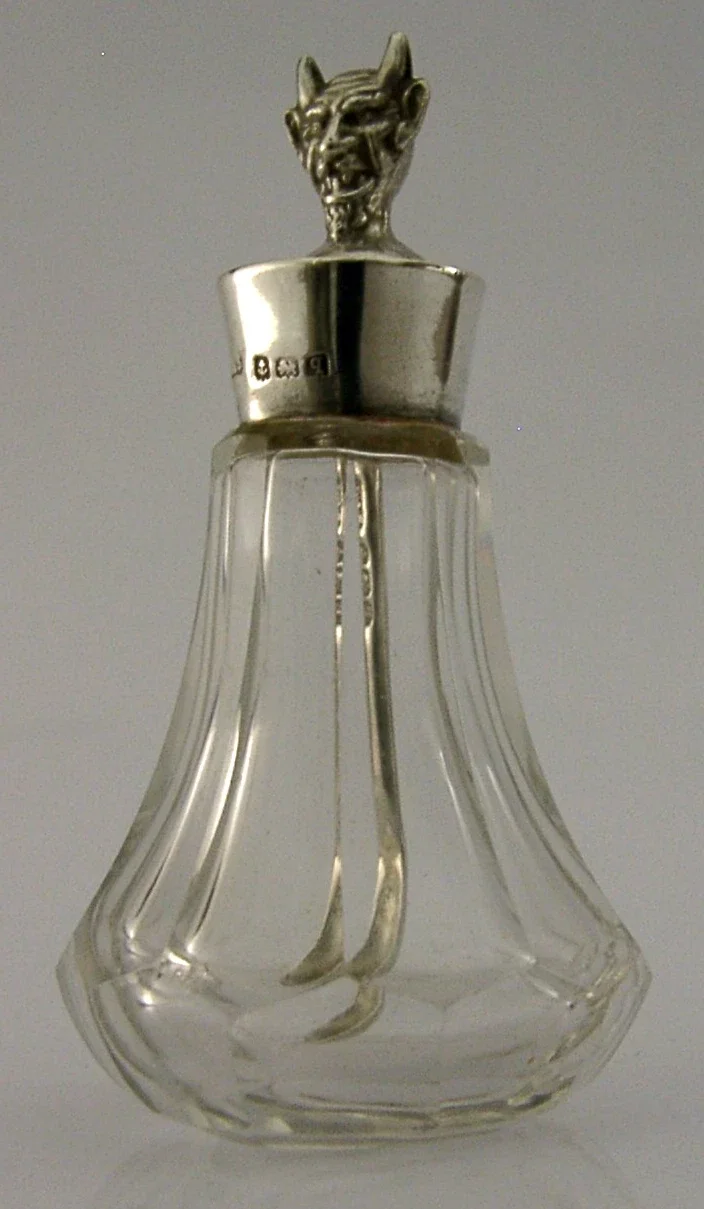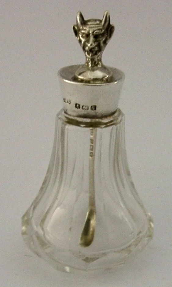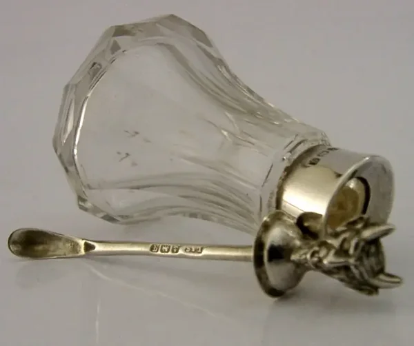 A rare English antique solid sterling silver and glass cayenne, laudanum etc... bottle and spoon. It is hallmarked for Birmingham 1915 with the maker being L&S. It has been beautifully made having the Devil to its lid. It is in super condition being free from dings splits and repairs. It measures 3 inches (7.2cm) tall and weighs 37 grams. A very unusual piece.