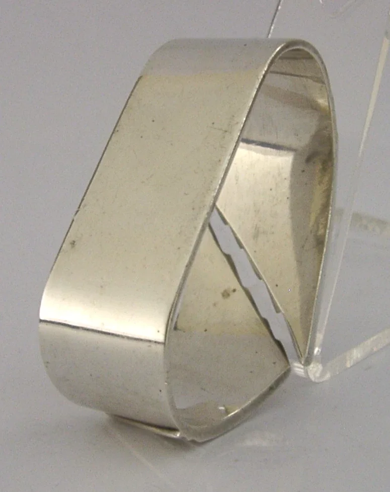 A beautiful heavy hand made English Mid Century Modern solid sterling silver napkin ring. It is hallmarked for London 1955 with the maker being R E Stone. It has been superbly designed and is in superb condition having no dings splits or repairs. It measures over 2.25 inches (5.8cm) across by 1 inch (2.6cm) wide by 1.5 inches (3.6cm) tall and weighs 52 grams. A rate stylish example.