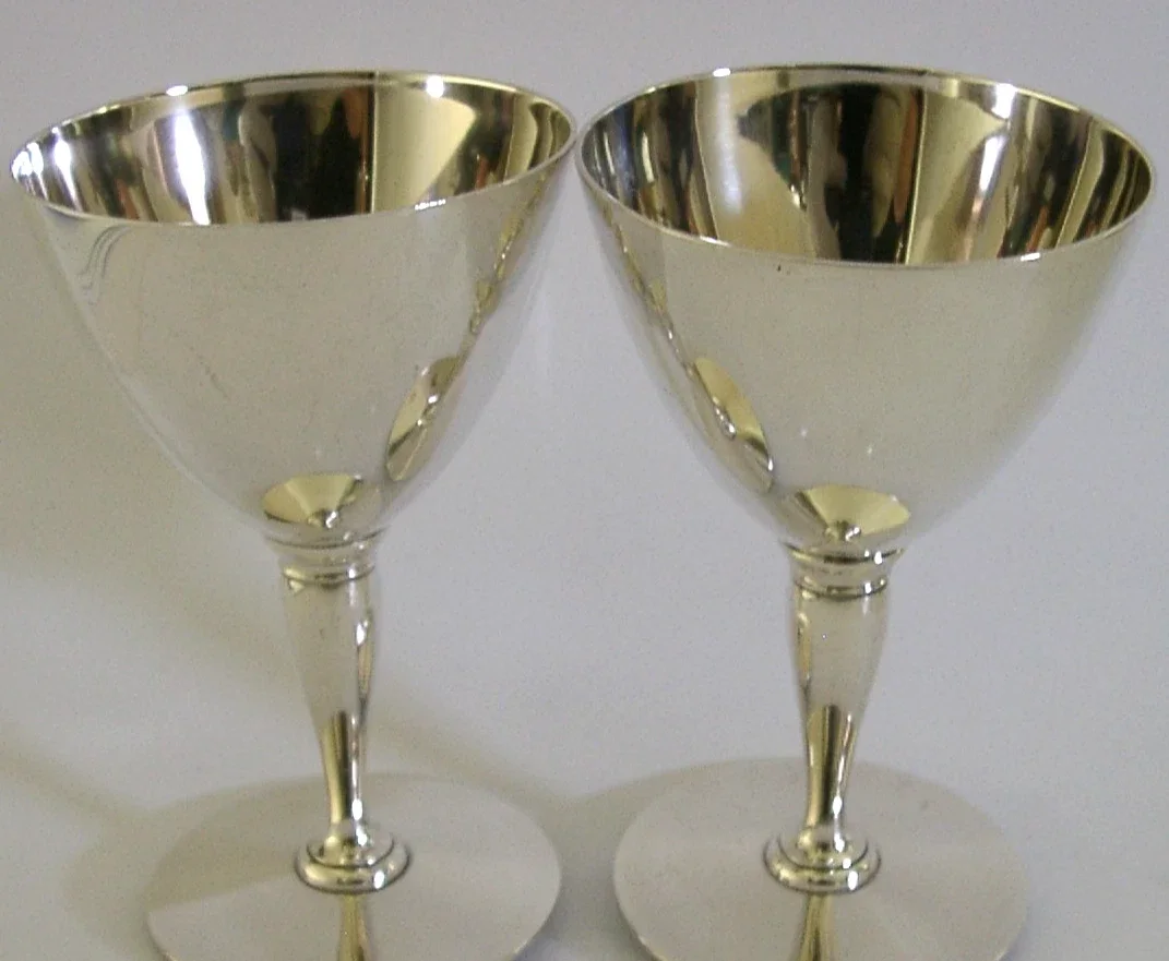 A beautiful very high quality pair of American solid sterling silver cocktail glasses. They are hallmarked STERLING along with the makers marks of Tiffany and Co, used 1907-1947. I would date these to c1920s. They have a very stylish design and are in super condition being free from from dings splits distortions and repairs. They measures approx. 4.25 inches (10.5cm) tall by 2.75 inches (6.8cm) across the rims and combined they weigh 246 grams. A top quality well made very stylish set epitomising the era.