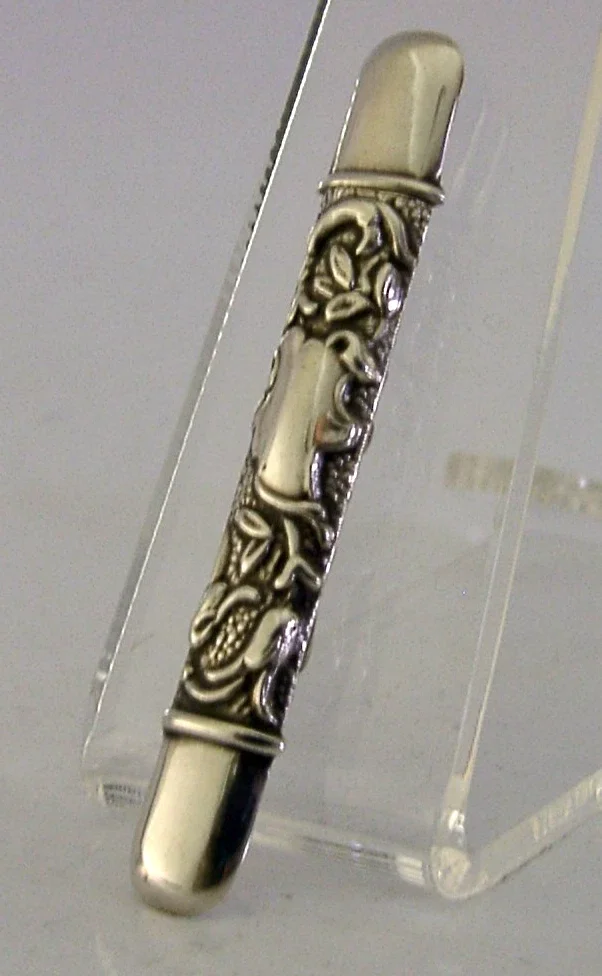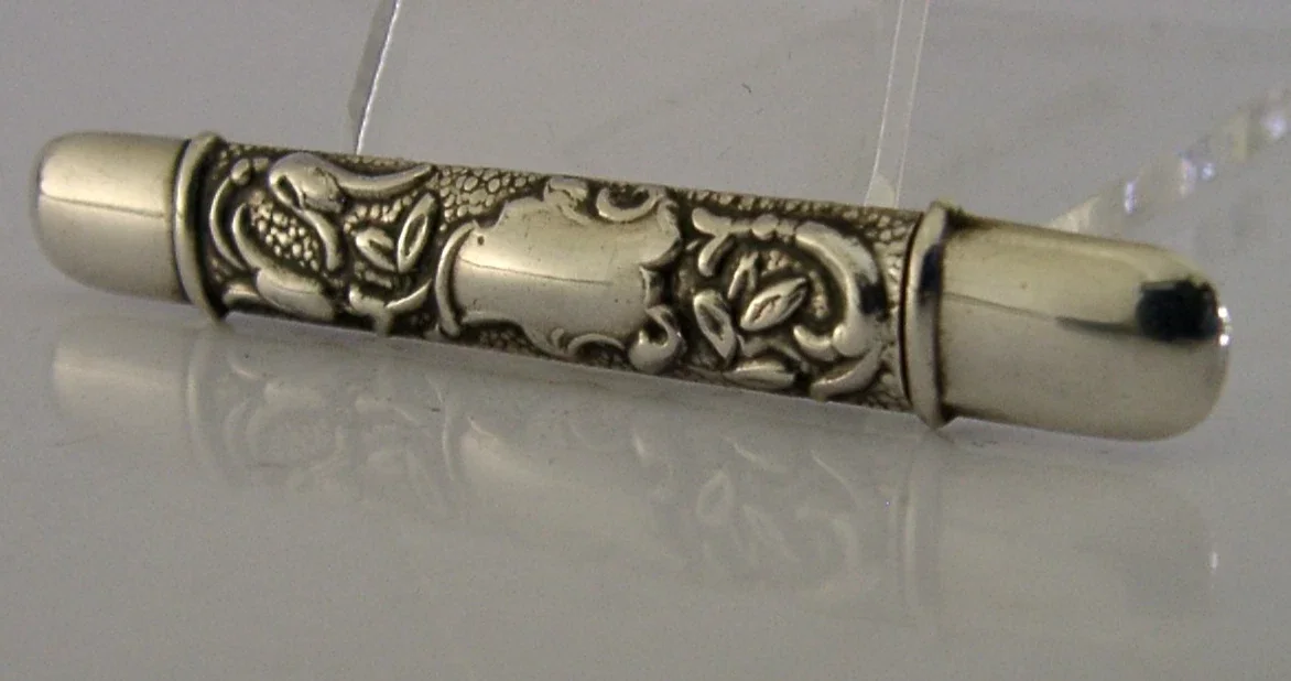 A very pretty English antique solid sterling silver needle case. It is hallmarked for Birmingham 1904 with the maker being A & J Zimmerman Ltd (Arthur & John Zimmerman). It has been beautifully designed with the cartouches being vacant. It is in superb condition being free from dings splits and repairs. It measures approx. 2.25 inches (5.8cm) long and weighs 3 grams. A very pretty piece.