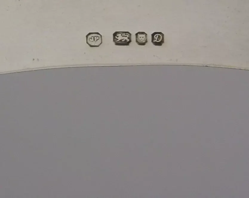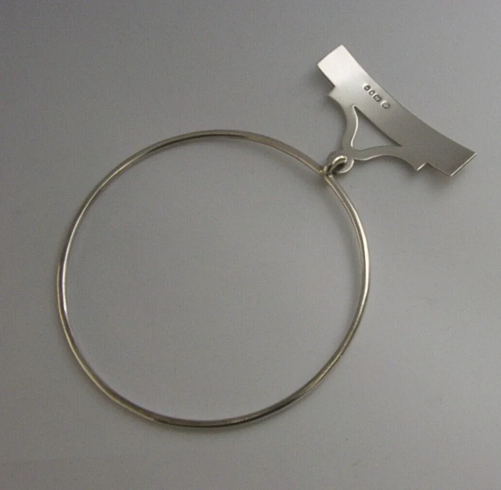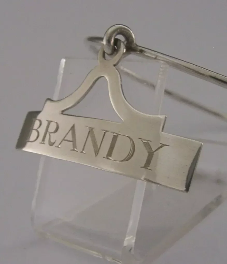 A very nice quality unusual English solid sterling silver Brandy decanter collar/label. It is hallmarked for London 1978 with the maker’s marks being JP. It has been well made and is in superb condition being free from dings splits and repairs, note the loop goes around the bottle or decanter - this is also silver. The label measures approx. 2 inches (5.2cms) across by 1.25 inches (3.2cms) tall and the loop measures 3.25 inches (8.2cms) across and combined weighs 19 grams. A very nicely made clean piece.