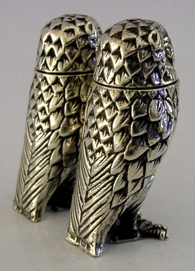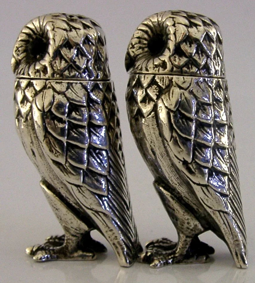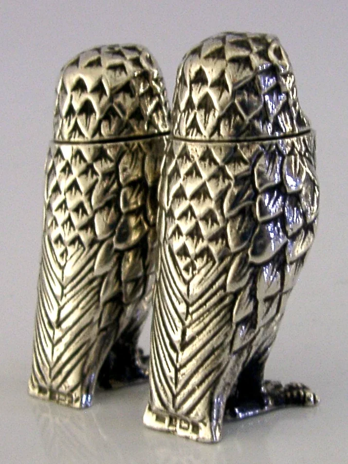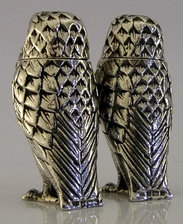 WONDERFUL ENGLISH STERLING SILVER OWL SALT & PEPPER POTS CRUET SET 1992 NOVELTY