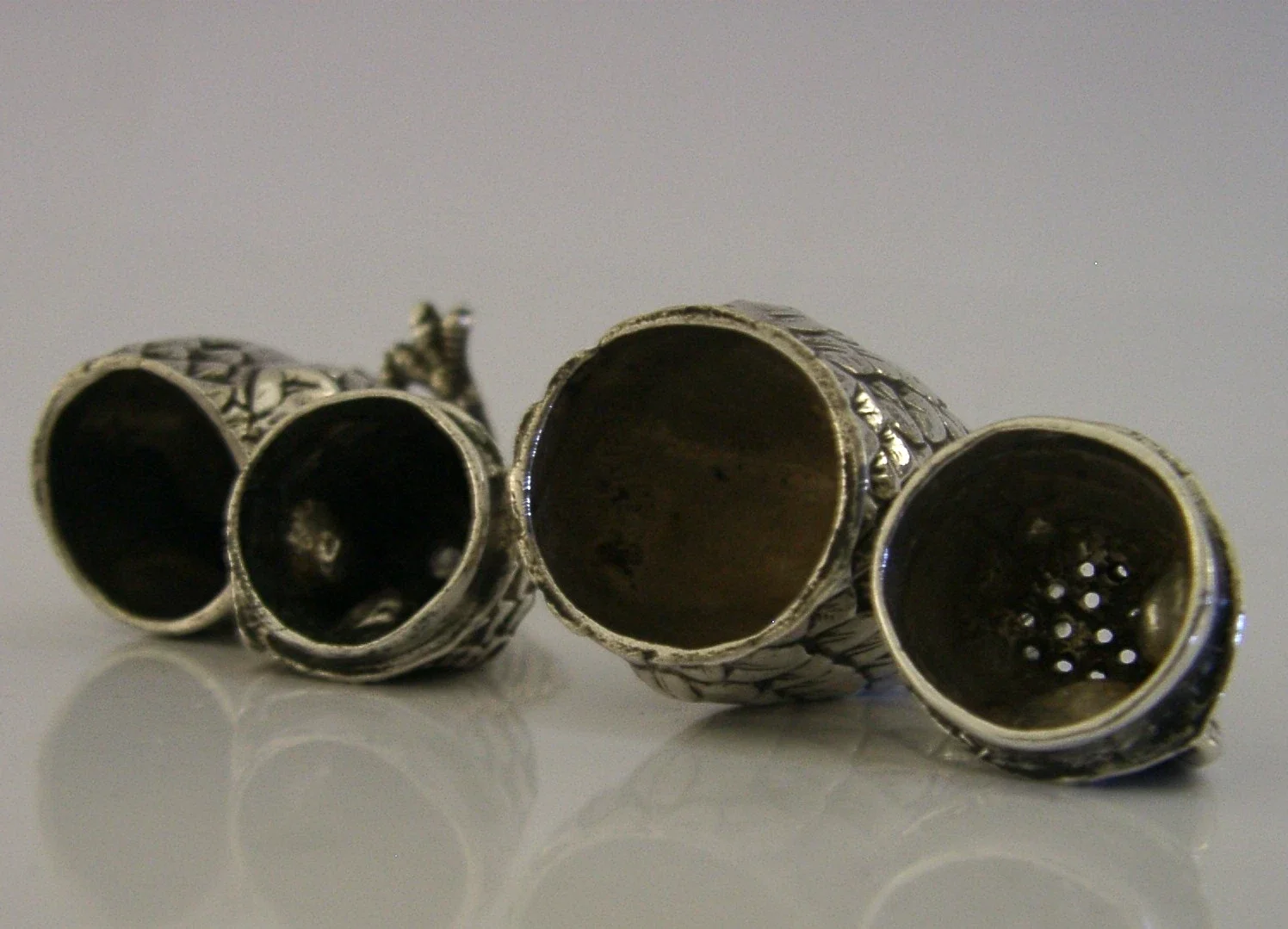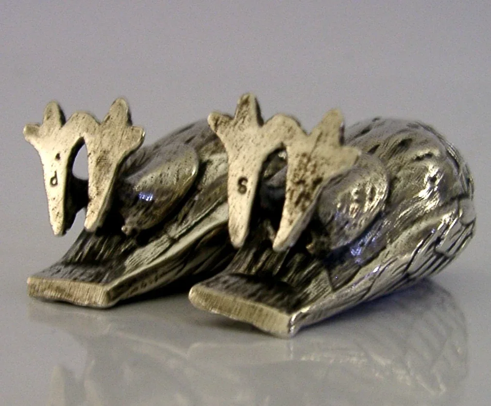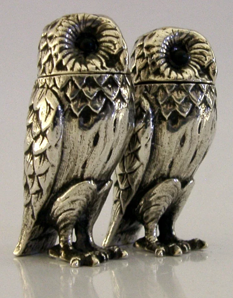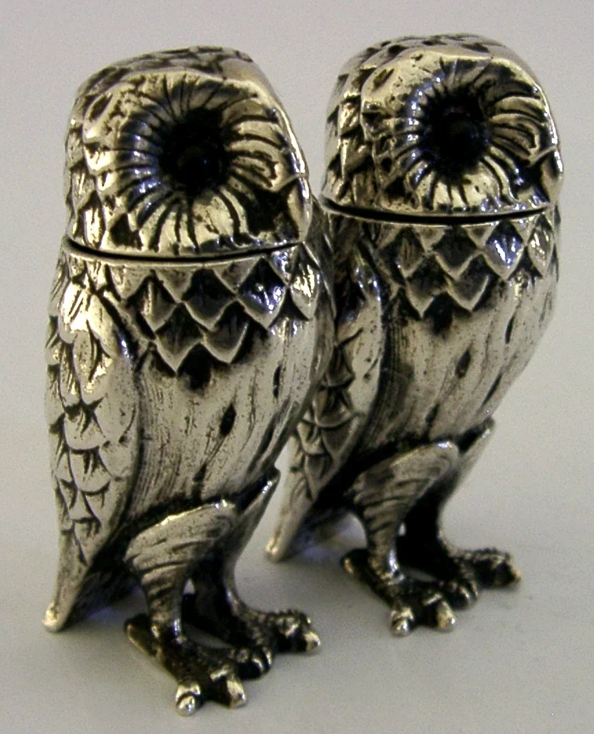 WONDERFUL ENGLISH STERLING SILVER OWL SALT & PEPPER POTS CRUET SET 1992 NOVELTY