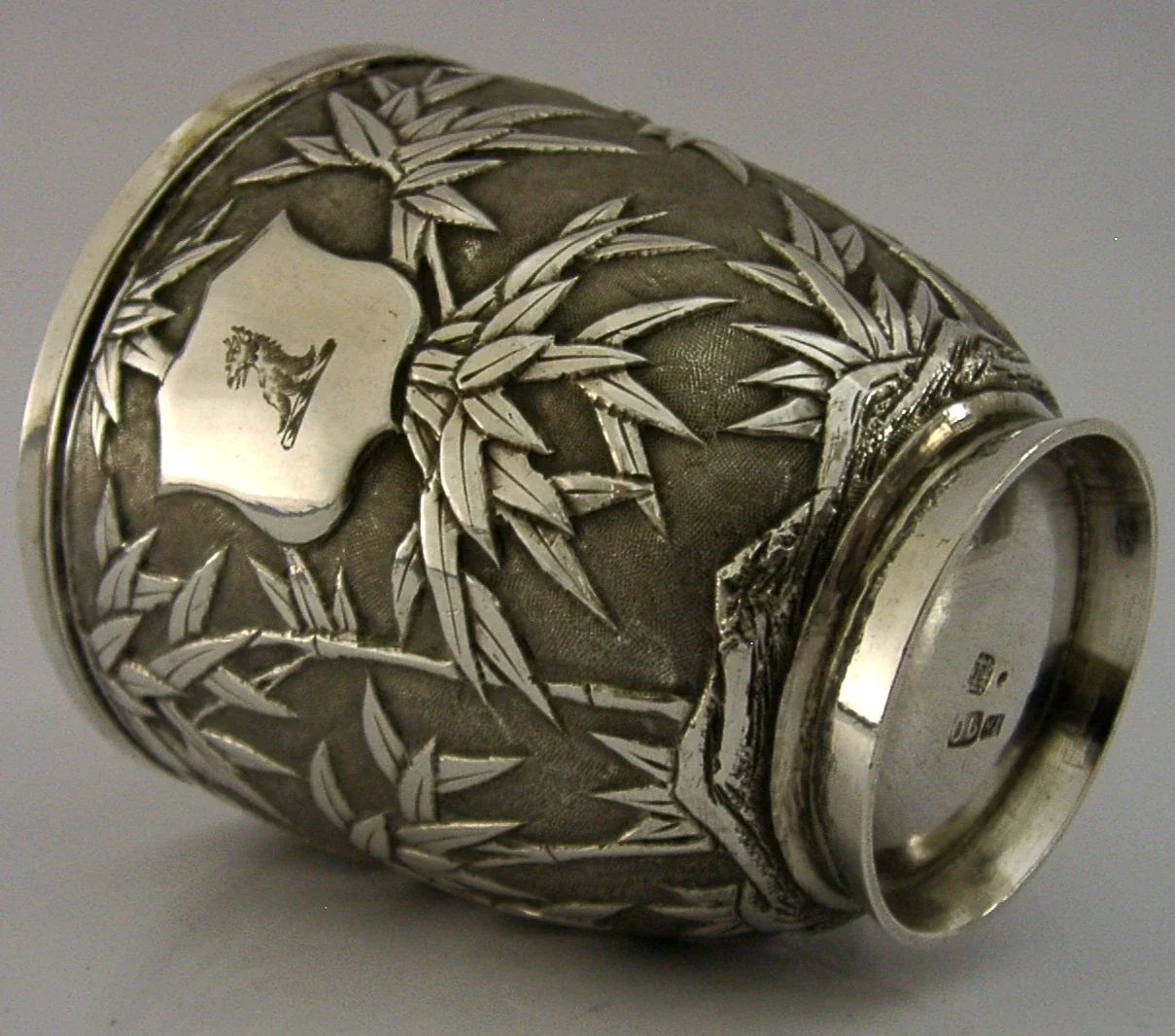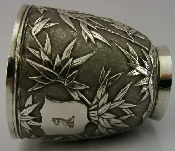 A beautiful Chinese Export solid silver tea cup. It is hallmarked with Chinese character marks along with the 90 standard mark and the makers mark being YH. It has been superbly made being decorated with a bamboo design. The cartouche has been engraved with a crest used by the Griffin family. It is in superb condition being free from chips cracks dings splits and repairs. It measures over 3.5 inches (9cm) across including the handle by 2.5 inches (6.4cm) excluding it by over 2.75 inches (7.2cm) tall to the top of the handle and weighs 84 grams. A beautifully made piece.