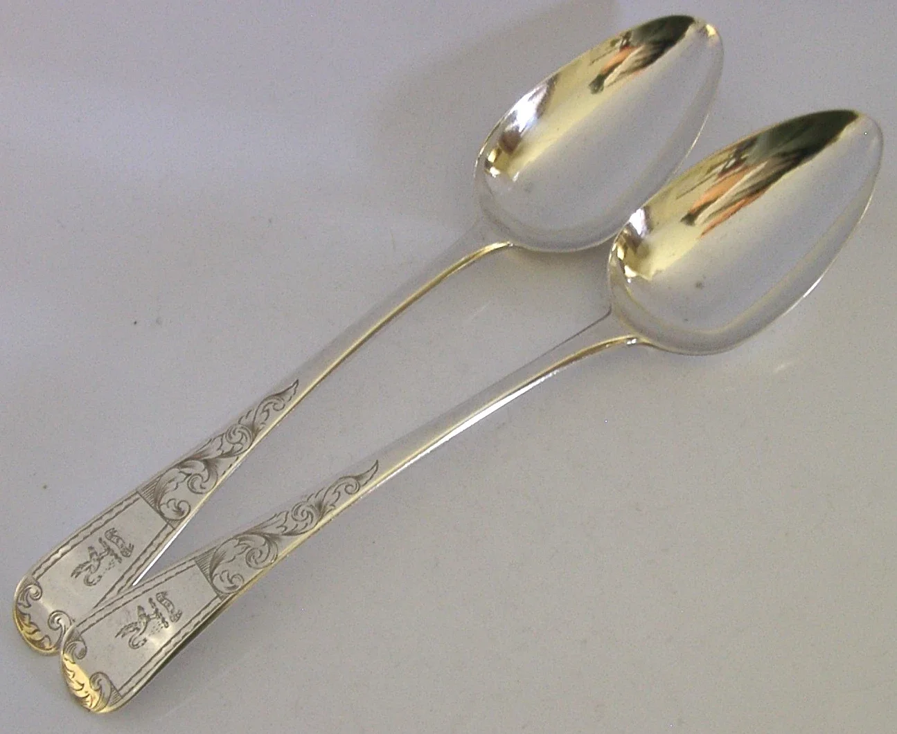 A beautiful pair of English Georgian antique solid sterling silver serving spoons. They are hallmarked for London 1801 with the maker being William Eley I & William Fearn. They have been beautifully made being engraved with a crest used by the Cullen family. They are in superb condition being free from dings, splits and repairs. They measure approx. 8.75 inches (22.2cm) long by 1.75 inches (4.4cm) wide and have a combined weight of 128 grams. A very good quality set.