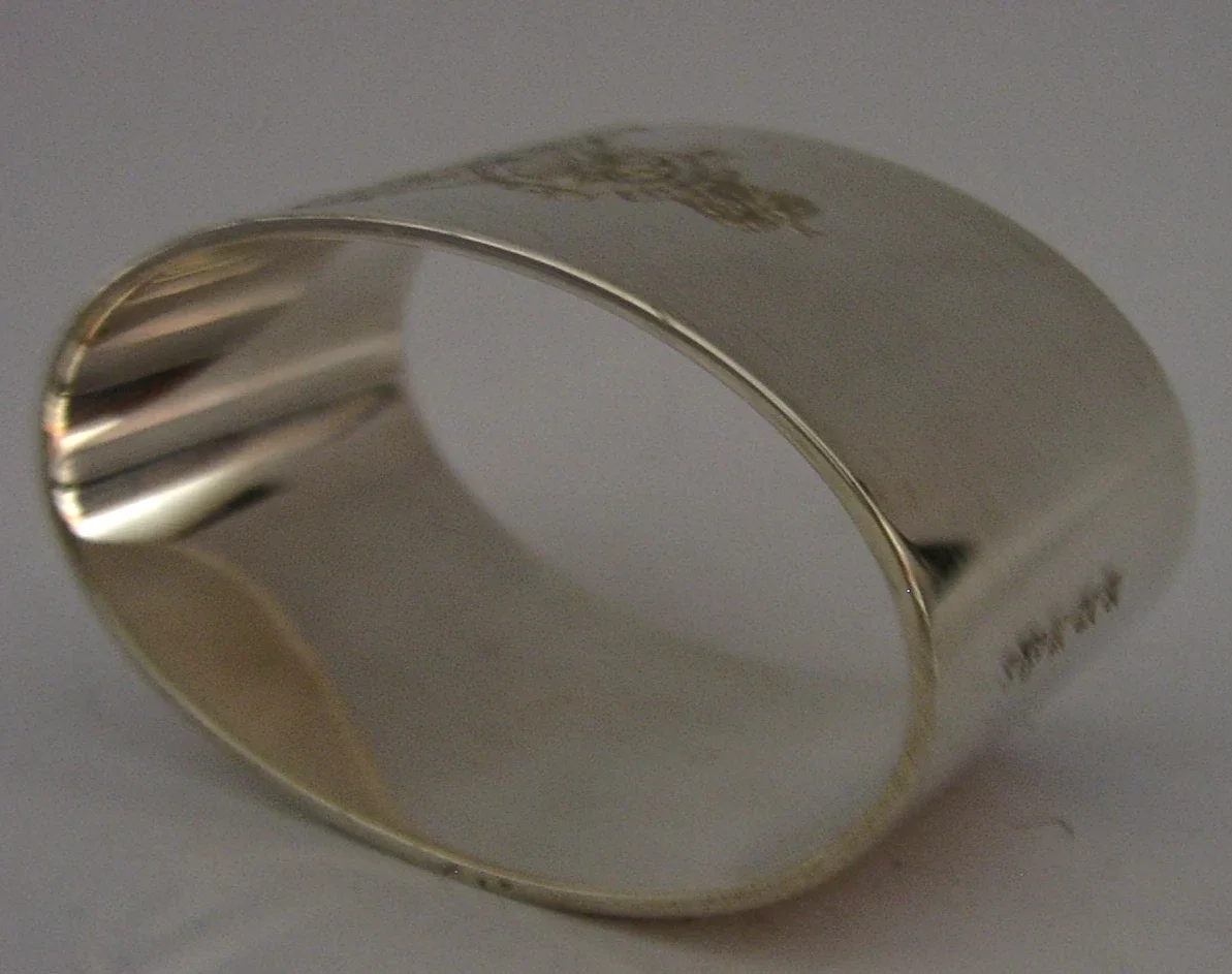 A rare English solid sterling silver napkin ring. It is hallmarked for Birmingham 1967 with the maker being J B Chatterley & Sons Ltd. It has been superbly designed being engraved with the Royal Artillery's badge and motto. It is in super condition being free from dings splits holes and repairs. It measures over 2.25 inches (5.4cm) across by 1.5 inches (3.6cm) wide by 1.25 inches (3.2cm) tall and weighs 58 grams. A very interesting piece.