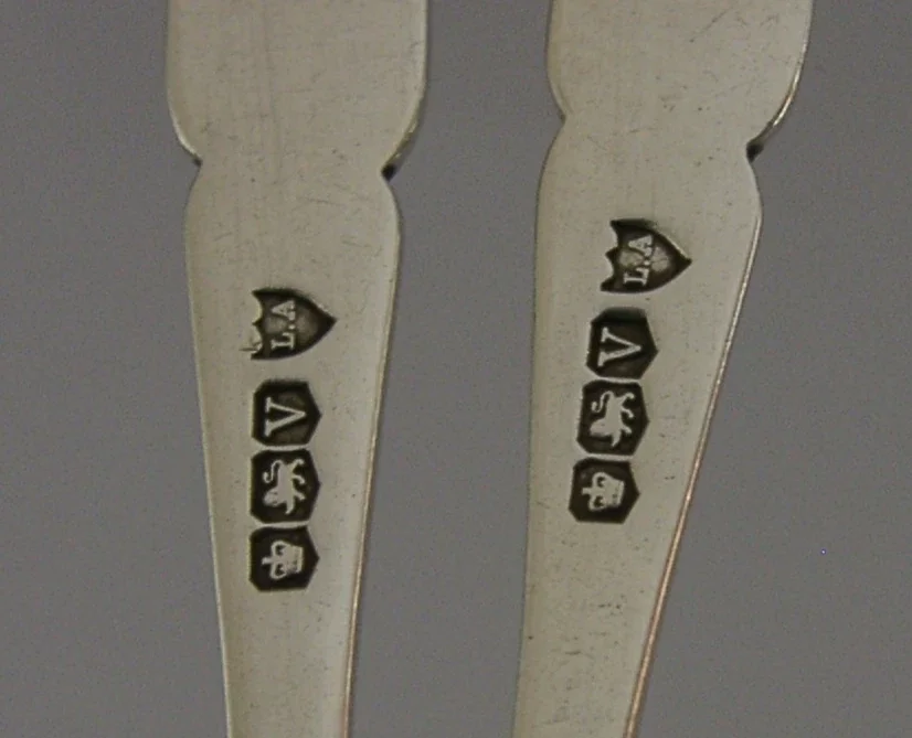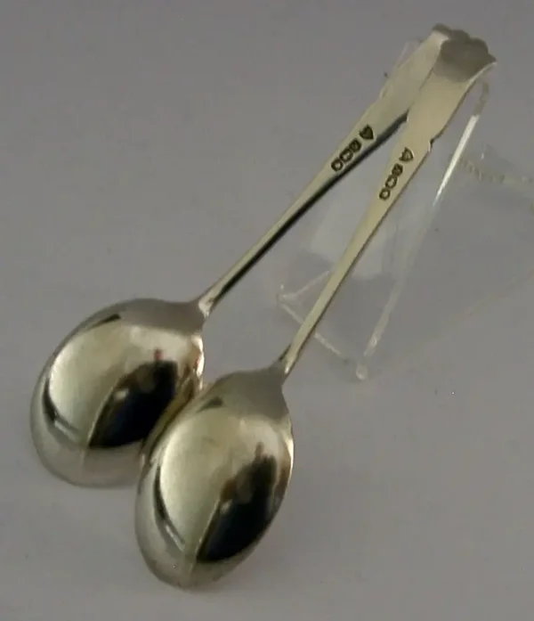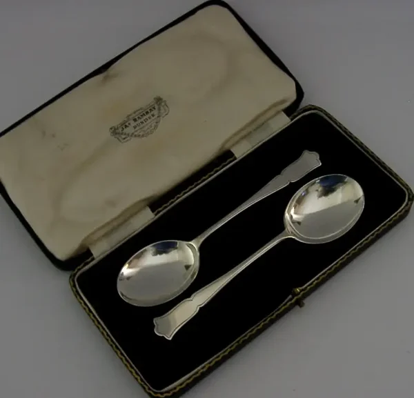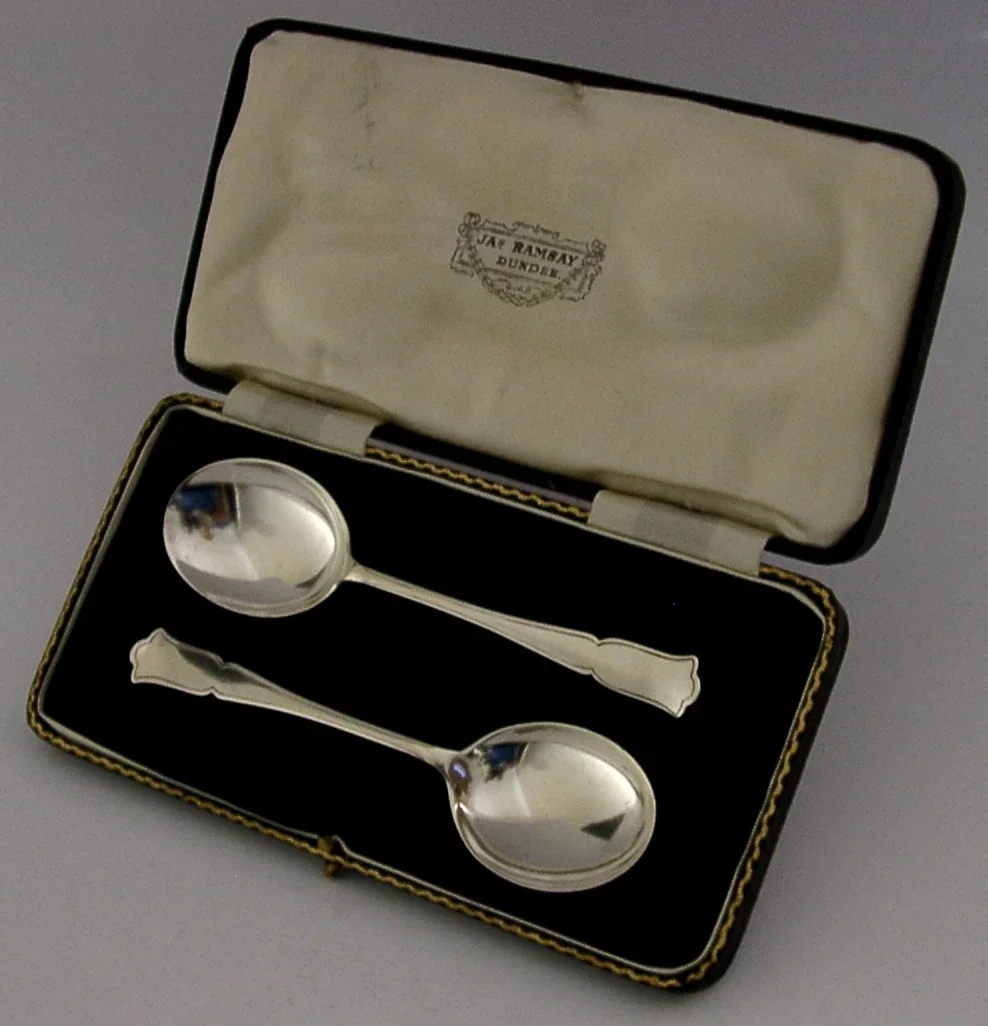 A superb set of two English antique cased solid sterling silver marmalade / jam spoons. They are hallmarked for Sheffield 1938 with the maker being Allens (A Laurence Allen). The retail case is that of JAs Ramsay of Dundee so most likely designed to be used for marmalade - Dundee being famous for it. They have been superbly made and are in superb condition being free from dings splits and repairs. The case is also superb. They measures 4.5 inches (11.5cm) long by over 1 inch (3cm) wide and have a combined weight of 26 grams excluding the case. Superb examples.