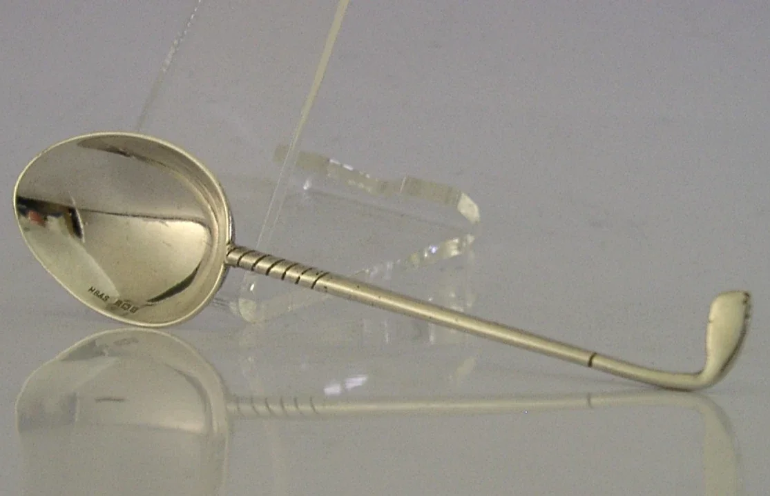A more unusual English solid sterling silver sporting spoon. It is hallmarked for Birmingham 1968 with the maker being HB&S. It has been superbly designed with the handle being in the form of a golf club. It is in super condition being free from dings splits distortions and repairs. It measures over 4 inches (10.6cm) long by almost 1 inch (2.5cm) wide and weighs 8 grams. A very nicely designed piece.