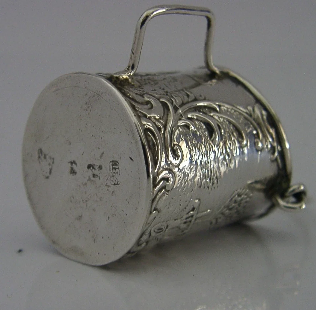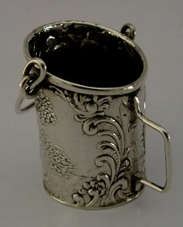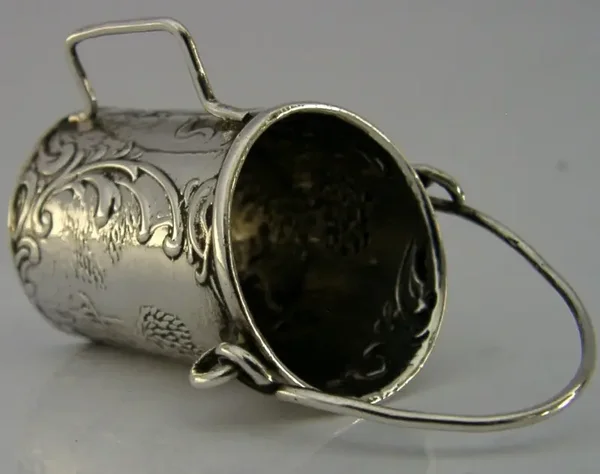 A beautiful German Hanau solid sterling silver dolls house miniature. It is hallmarked with German Hanau marks along with the English import marks for London 1897 and the importer being David Bridge. It have been beautifully made in the form of a coal scuttle bucket. It is in superb condition being free from holes and repairs. It measures almost. 1.5 inches (3.6cm) tall by 1 inch (2.cm) wide and weighs 16 grams. A superbly designed beautiful rare piece that could make a rather unusual pin cushion if lined.
