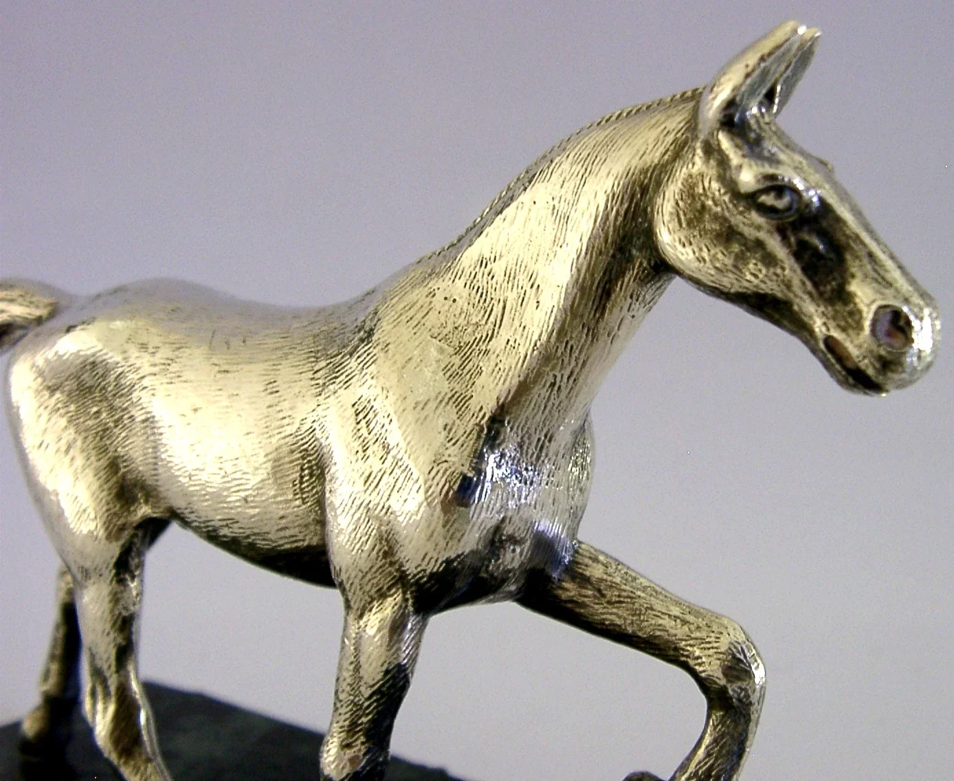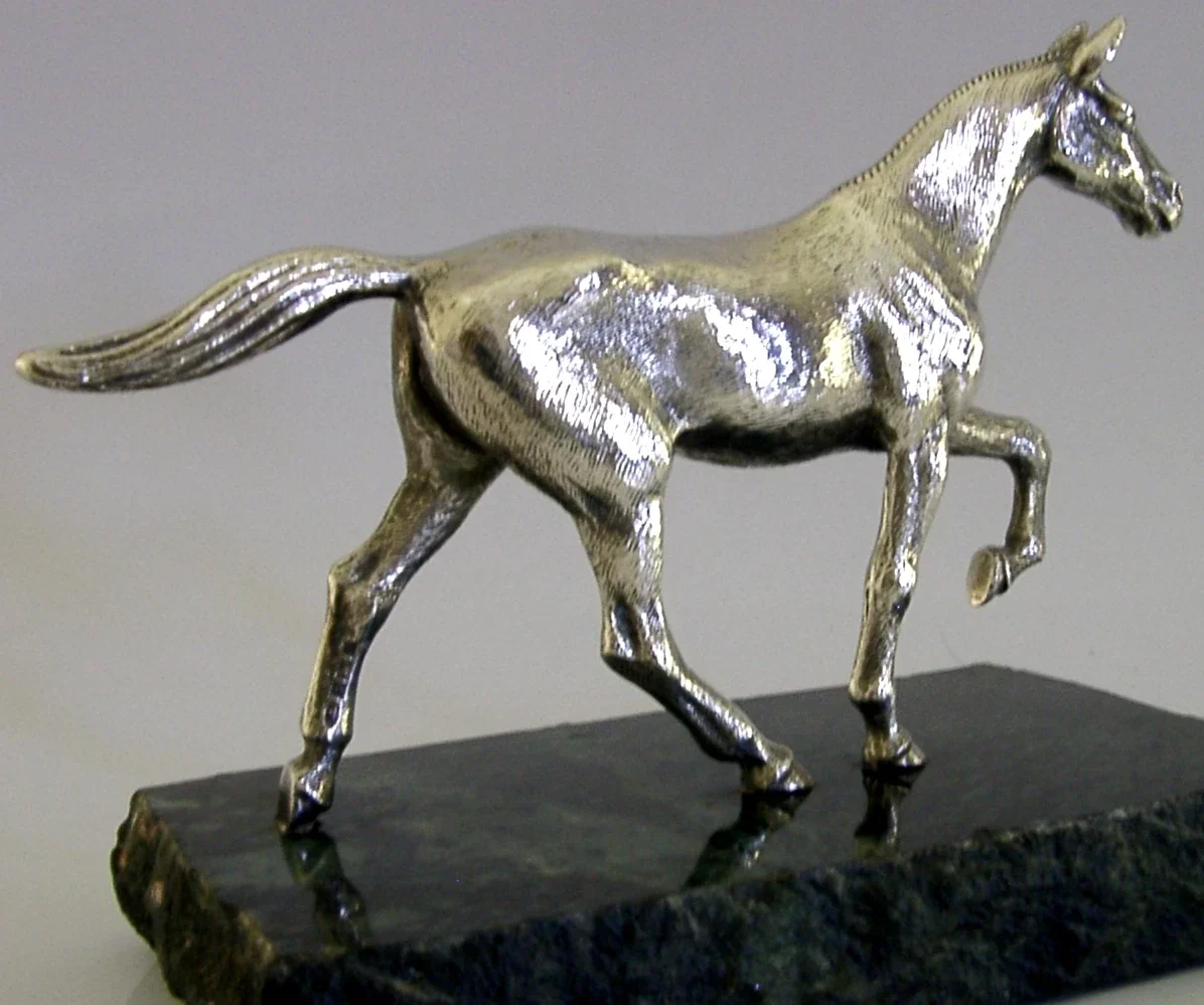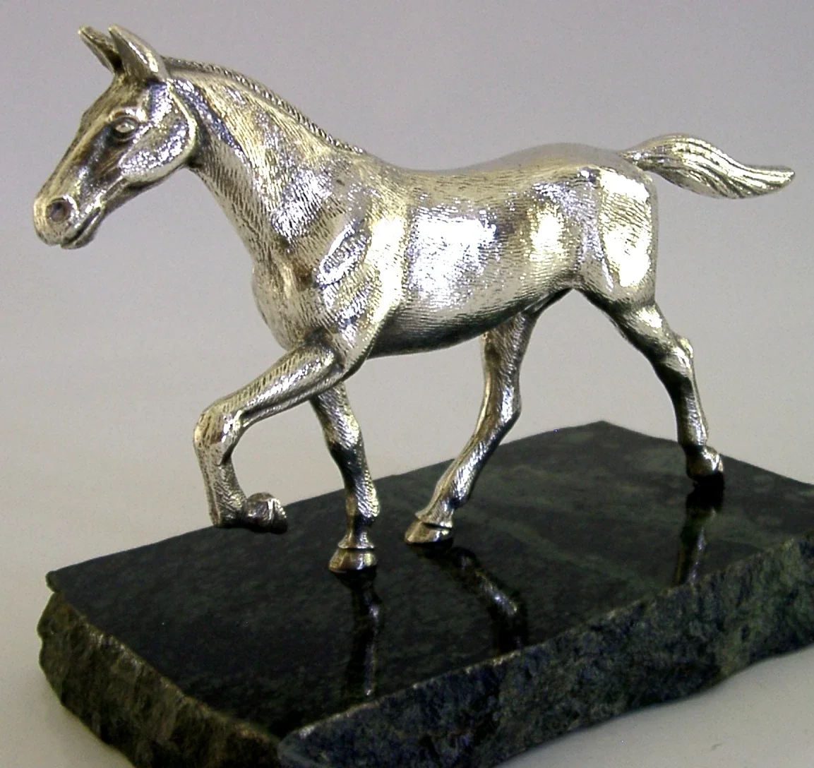 A superbly detailed good sized rare English solid sterling silver horse statue. It is hallmarked with English silver marks for Birmingham 1974 the makers marks being A E jones. It has been superbly modelled in the form of horse on a green marble base. It is in perfect condition being free from dings splits and repairs, the base is free from chips cracks and repairs. The horse measures over 6 inches (15.6cm) long by 4.5 inch (11.3cm) tall and weighs 865 grams. A beautiful piece.