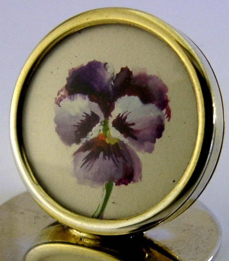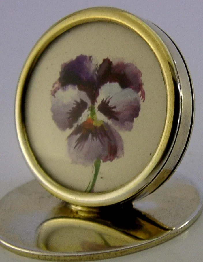 STERLING SILVER PANSY VIOLA FLOWER HAND PAINTED ENAMEL MENU HOLDER ANTIQUE 1905