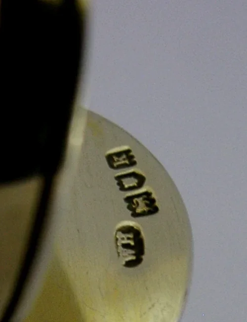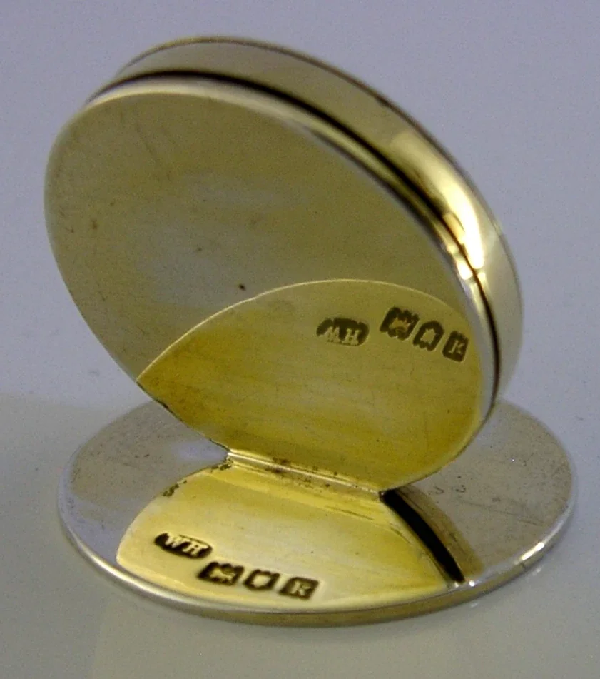 A top quality English antique solid sterling silver gilt and hand painted enamel place card or menu holder. It is hallmarked for Birmingham 1905 with the maker being WH. It has been beautifully made being hand painted with a pansy or viola flower. It is in superb condition being free from dings splits and repairs. It measures approx. 1.25 inches (3cm) across the base by a fraction less tall and weighs 18 grams. A very well made beautiful piece.