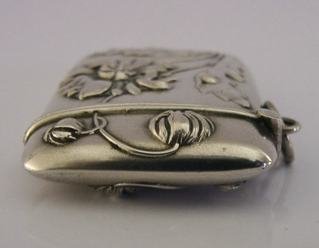 BEAUTIFUL 800 SOLID SILVER FLOWER VESTA CASE 1905 ART NOUVEAU ANTIQUE