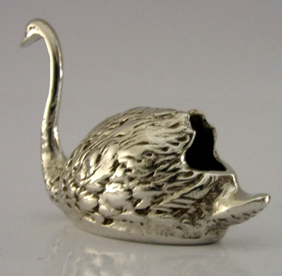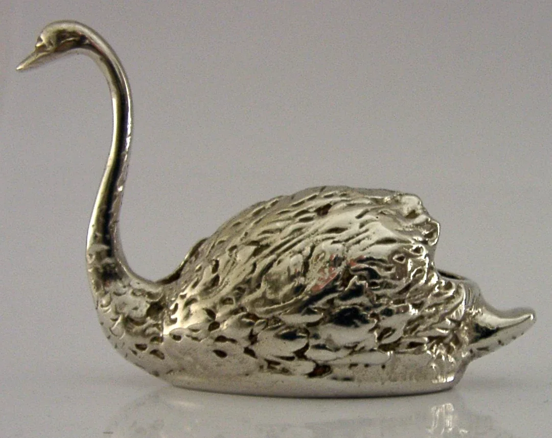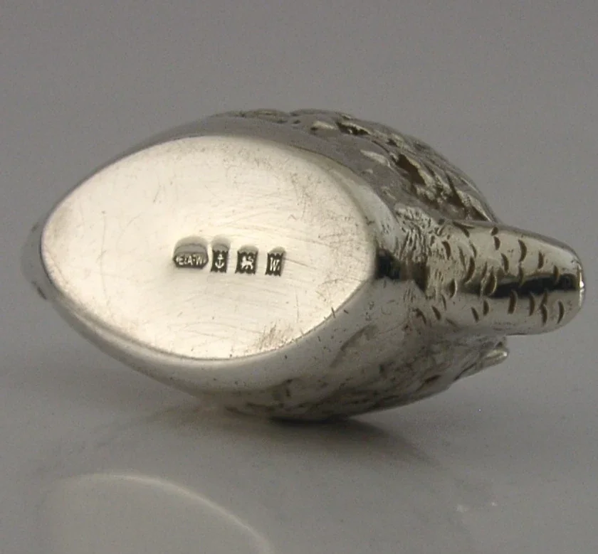 A very unusual English solid sterling novelty swan, possibly a pin cushion. It is hallmarked for Birmingham 1971 with the maker being EAW. It has been beautifully cast and is in superb condition being free from dings splits holes and repairs, if used as a pin cushion a cushion will need to be inserted. It measures approx. 2.75 inches (7cm) long by 1 inch (2.6cm) wide by 2 inches (5.1cm) tall and weighs 48 grams. A very good quality piece.