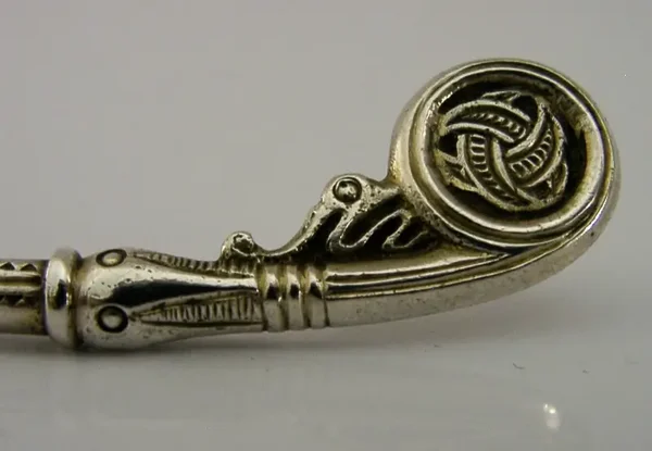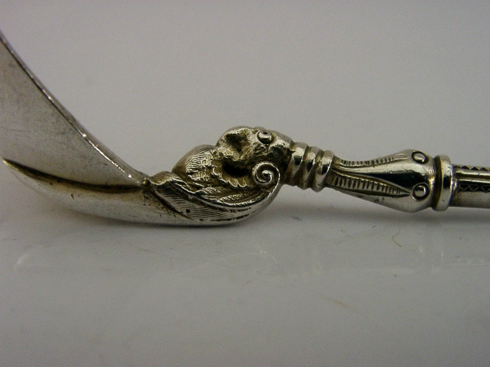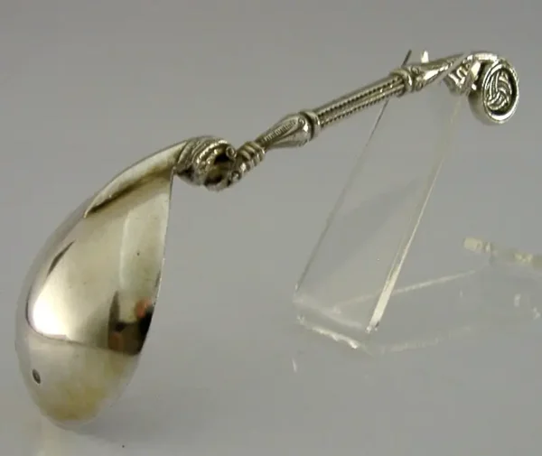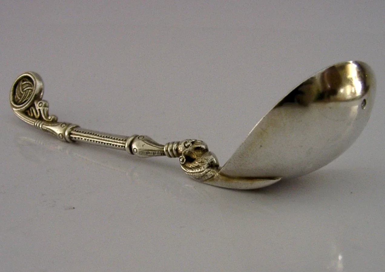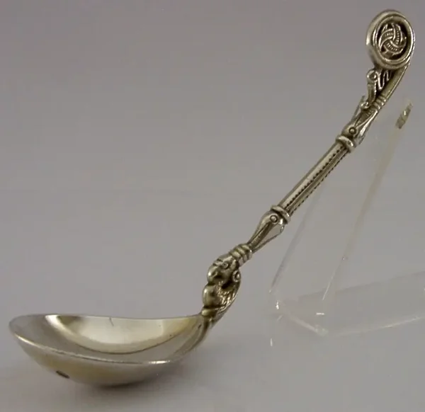 A beautiful Danish solid silver ladle spoon. It is hallmarked with the Danish three towers silver mark and the date code 13 for 1913. It has been beautifully made having Dragestil Arts & Crafts designed. It is in superb condition being free from dings splits and repairs. It measures 5.25 inches (13.2cm) long by over 1.5 inches (4.1cm) wide and weigh 46 grams. A beautifully designed piece.