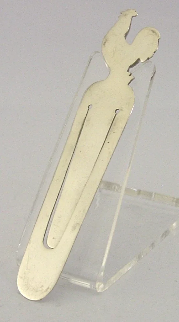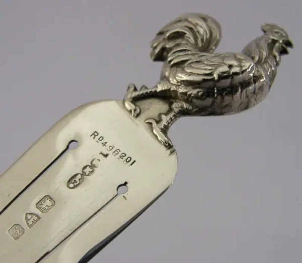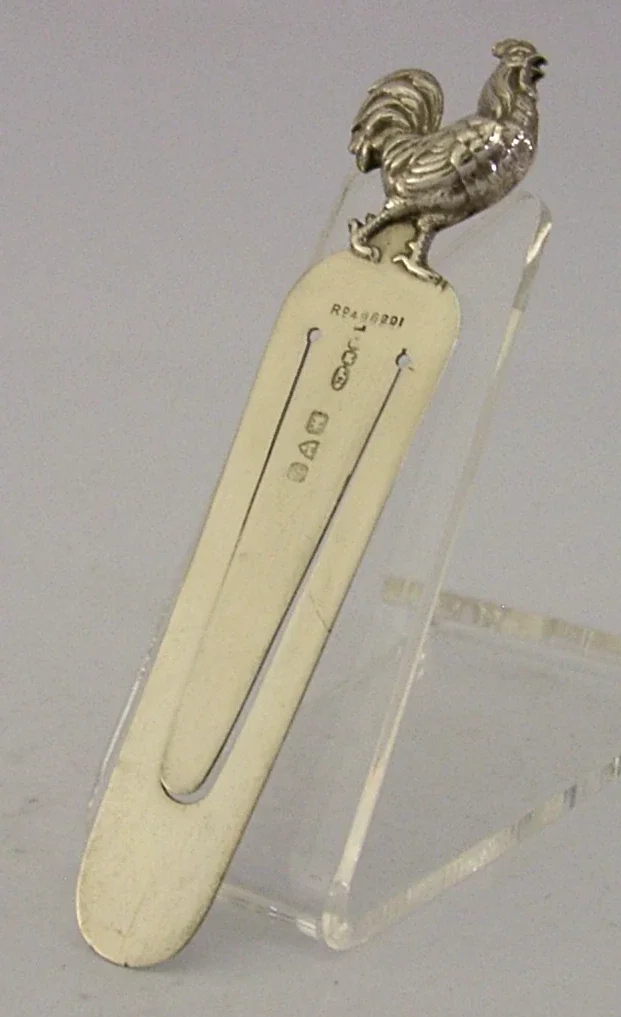 A rare Antique English solid sterling silver bookmark or page maker. It is hallmarked for Chester 1907 with the maker being S Mordan. It has been beautifully designed with the terminal being in the form of a Cockerel or Hen. It is in super condition being free from dings splits and repairs. It measures approx. 3.5 inches (9.2cm) long by 0.75 inch (2cm) wide and weighs 7.5 grams. A nice rare piece.