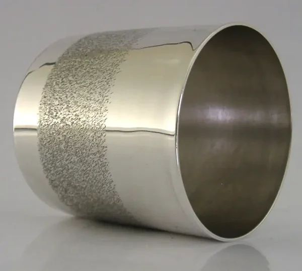 A very nicely designed stylish Austrian solid sterling silver beaker cup. It is hallmarked with Austrian 800 silver marks used from 1922 - I would date it to c1950. It has been superbly designed having a modernist textured band. It is in superb condition being free from dings splits distortions and repairs. It measures 2.25 inches (5.7cm) tall by a touch less wide (5.2cms) and weighs 61 grams. A very good quality well designed piece.