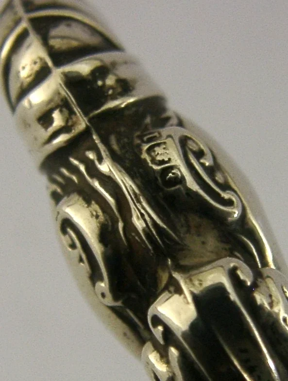 A nicely designed novelty sterling silver handled corkscrew. It is hallmarked for Birmingham 1910 with the maker being absent. It has been unusually designed being in the form of Mr Punch. It is in superb condition being free from dings splits holes and repairs. It measures approx. 4.5 inches (11.2cm) long and weighs 12 grams (including the steel screw) - most likely for medicine / perfume bottles and such like. A very nicely made more unusual piece.