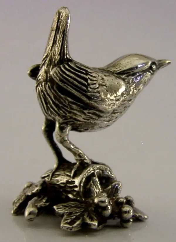 A superbly modelled sterling silver bird figure. It is hallmarked for London 1991 with the maker marks being PE for the highly regarded Paul Eaton well know for his garden birds. It has been beautifully modelled being finely cast in the form of a wren on a log. It is in super condition being free from dings splits and repairs. It measures approx. 1.5 inches (3.8cm) tall by 1.25 inches (3cms) and weighs 30 grams (all silver i.e. it is not filled). A very well designed high quality example.