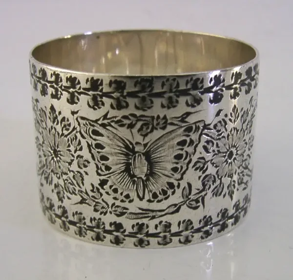 A beautifully engraved Victorian English antique solid sterling silver napkin ring. It is hallmarked for London 1837 with the makers marks being JA over JS. It has been superbly engraved with a butterfly on each side flying in opposite directions. It is in is in super condition being free from dings splits and repairs, light scratches inside. It measures approx. 1.75 inches (4.2cm) wide by 1.25 inches tall and weighs 25 grams. A very nice piece.