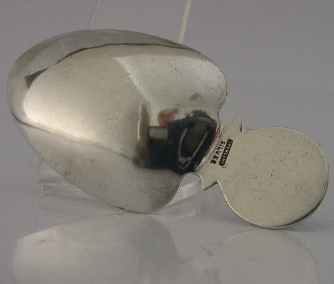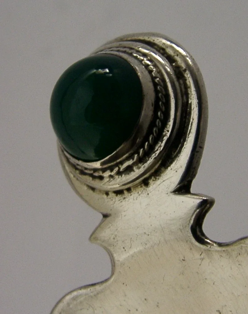 A superbly designed hand made solid sterling silver caddy spoon. It is hallmarked STERLING Silver. I do not know where it was made but it may have been Scotland. I would date it to the first quarter of the 20th century. It has been beautifully made being set with a polished green stone. It is is in super condition being free from dings splits chips cracks and repairs. It measures approx. 3 inches (7.5cm) long by 1.5 inches (3.7cms) wide and weighs 36 grams. A very nicely designed example.