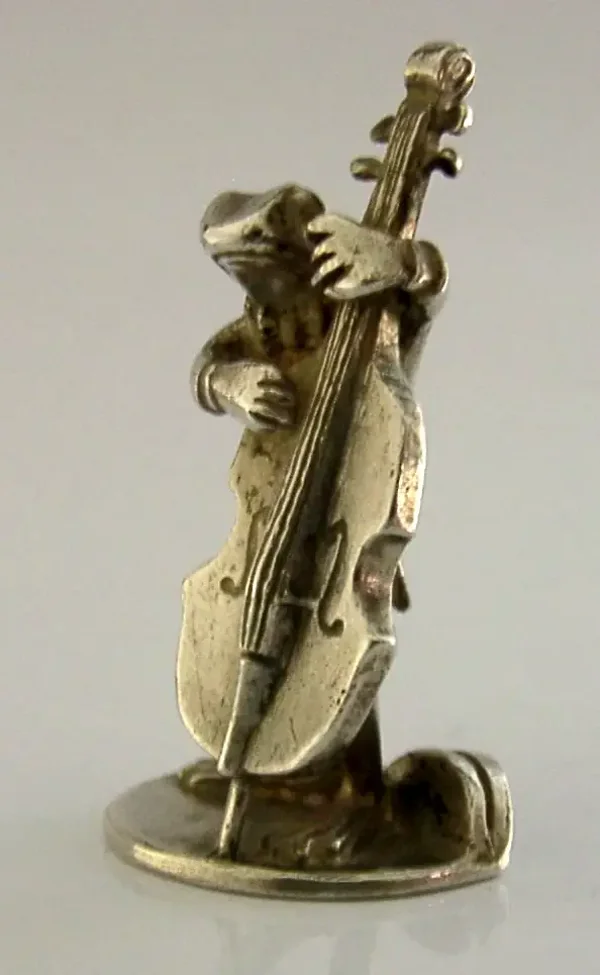 ENGLISH SOLID SILVER ANIMAL FROG CELLO DOUBLE BASS PLAYER MENU HOLDER 1996