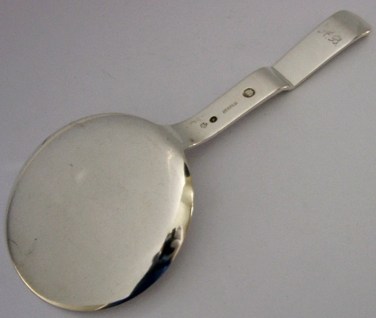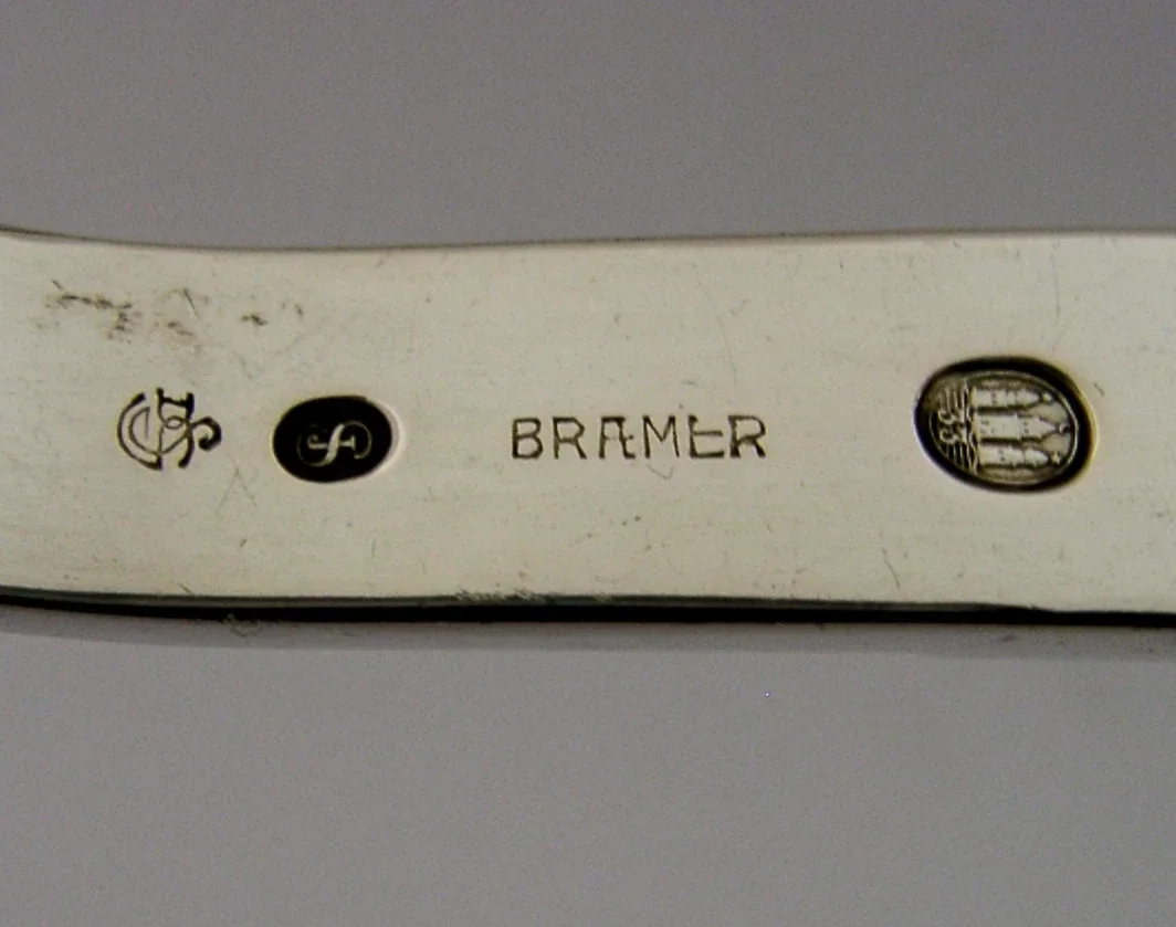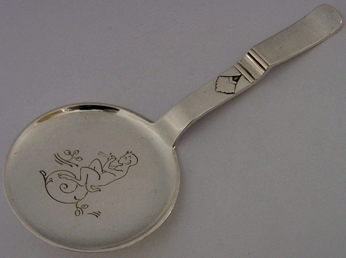 A stunning Danish solid silver serving piece (possibly for pastries). It is hallmarked with the three towers silver mark with the date 1933 and the makers / retailers mark BRAMER. It has been beautifully designed being engraved with an image of Pan, the god of Shepherds and Music. The handle reverse has been engraved AB. It is in superb condition being free from dings splits and repairs. It measures approx.7 inches (17.3cms) long by 3 inches (7.6cms) wide and weighs 64 grams. A beautifully made example.