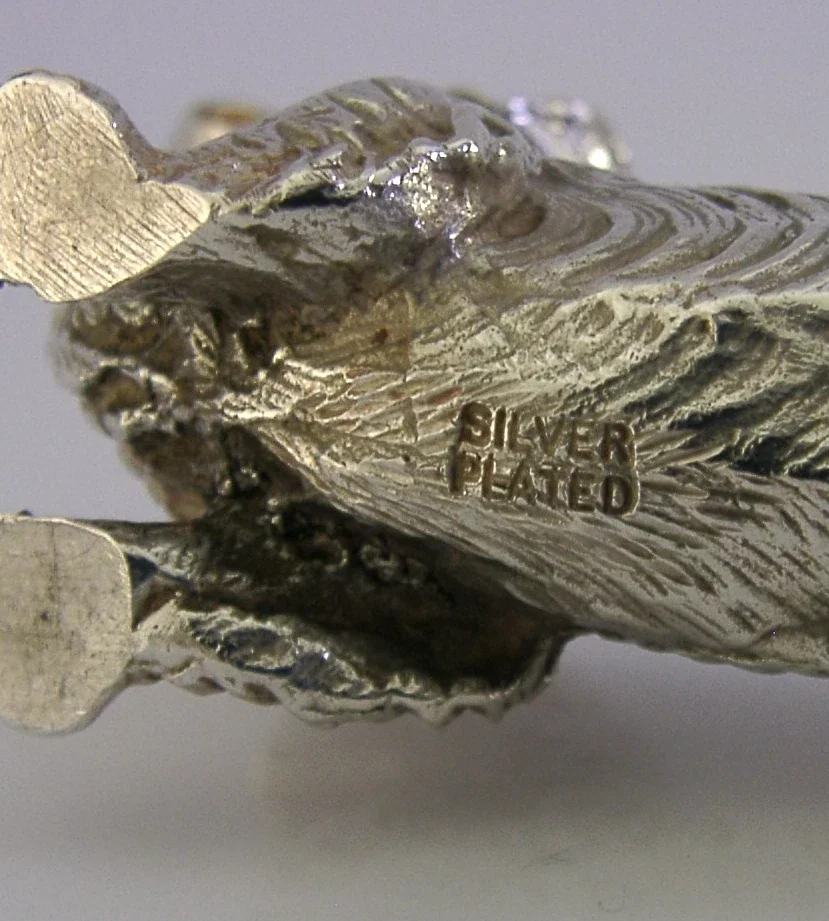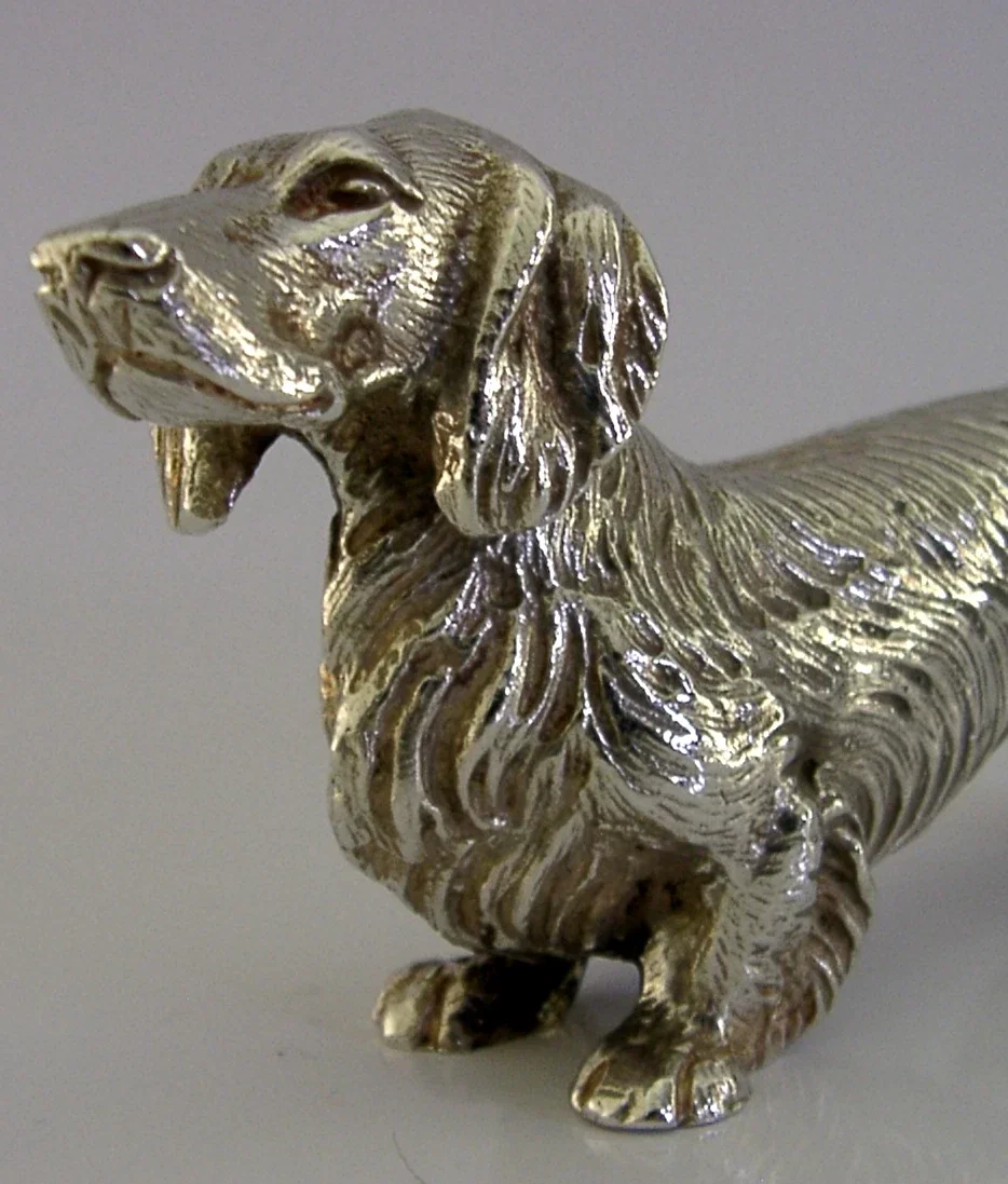 A superbly modelled silver plate animal figure. It is marked SILVER PLATED and it dates to c1950s-1970's. It has been beautifully modelled being finely cast in the form of a Dachshund dog. It is in super condition being free from dings splits and repairs. All the silver plate is original and complete. It measures over 5.5 inches (14.2cm) long by over 1 inch (3cm) wide by 2.25 inches (5.8cm) tall and weighs 420 grams. A very well designed high quality example.
