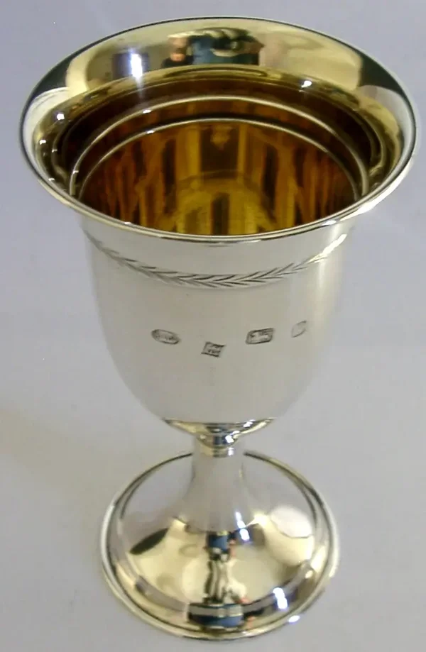 A very nicely made English solid sterling silver goblet. It is hallmarked for Birmingham 1985 with the maker being B&Co. It has been superbly designed having feature hallmarks and nicely detailed band. It is in superb condition being free from dings splits distortions and repairs, tiny mark near the base see final photo.. It measures almost 5.5 inches (13.9cm) tall by 3 inches (7.6cm) across the rim and weighs 79 grams. A very good quality piece.