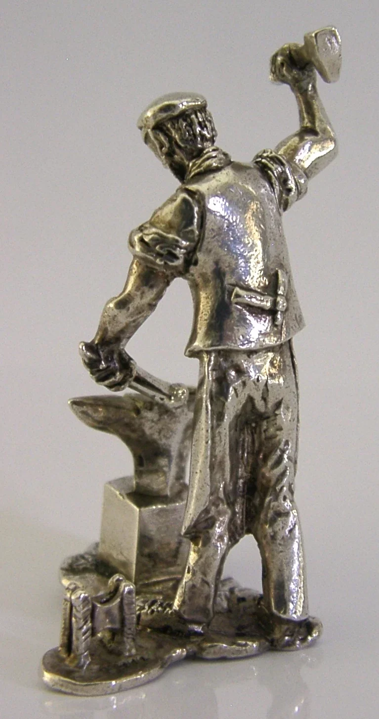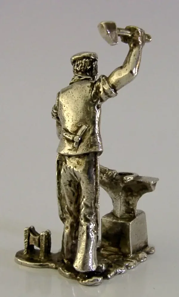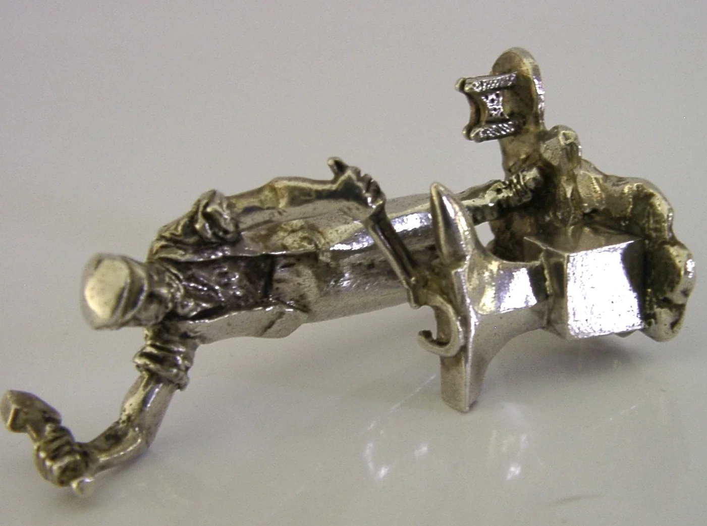 A very rare solid cast English solid sterling silver place card or menu holder. It is hallmarked for London 1981 with the maker being Thomas Charles Jarvis. It has been superbly designed being cast in the form of an Victorian Blacksmith, the place card slots into the foot-scraper. There was a set produced by TC Jarvis - all Victorian street characters but this one is seldom seen. It is in superb condition being free from dings splits and repairs. It measures approx. 2.5 inches (6.4cm) tall by 1.5 inches (3.6cm) across the base and weighs 46 grams. An interesting well made rare example.