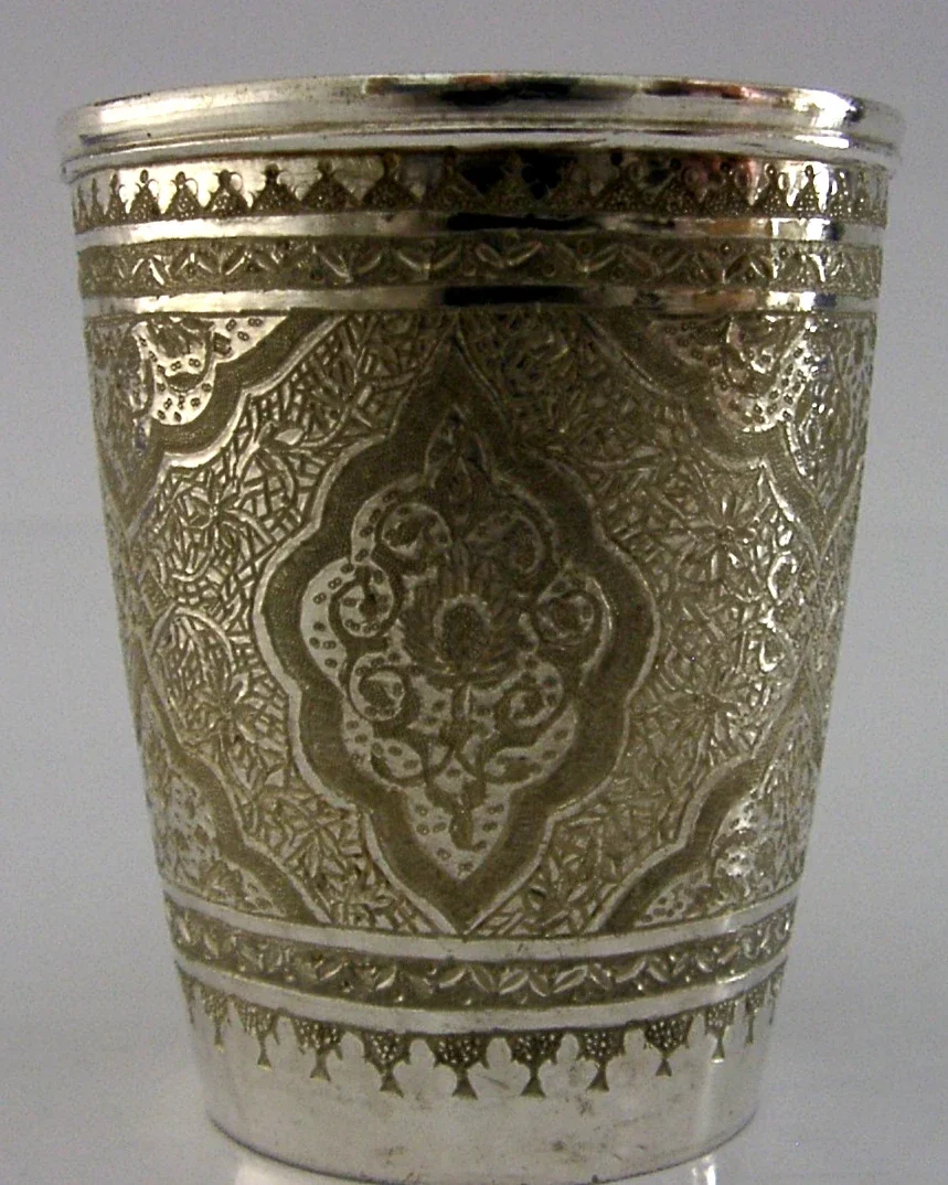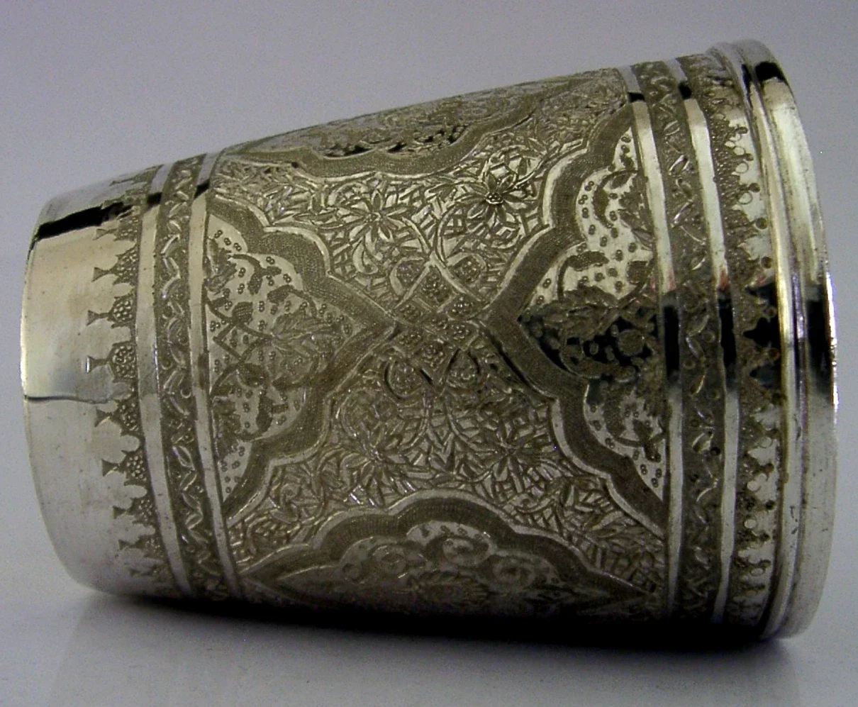 A nicely detailed Persian / Middle Eastern solid silver beaker cup. It is marked with the Persian marks and tests a 840 grade silver. I would date it to c1940. It has been superbly designed and is in super condition being free from dings splits holes and repairs. It measures almost 2.75 inches (6.8cm) tall to the rim by 2.5 inches (5.8cm) across the rim and over 1.5 inches (4cm) across the base and weighs 86 grams. A very nicely designed piece.
