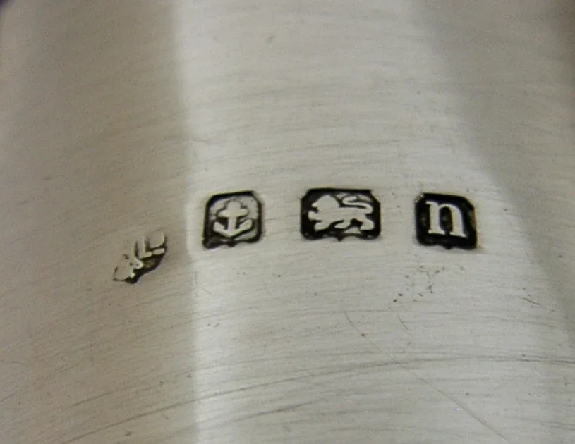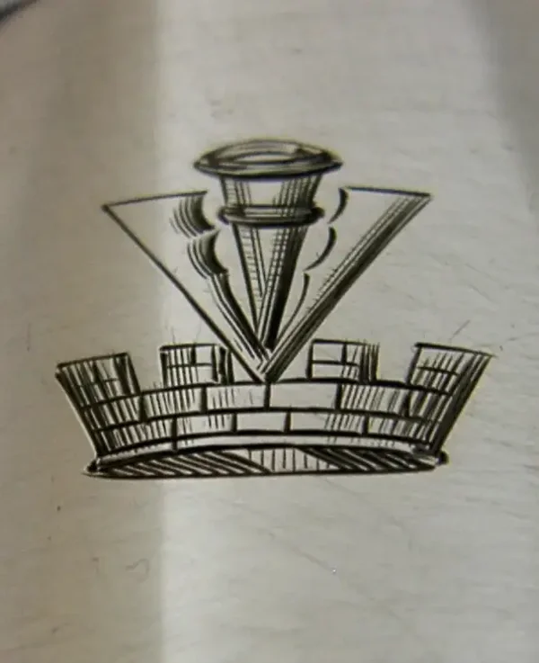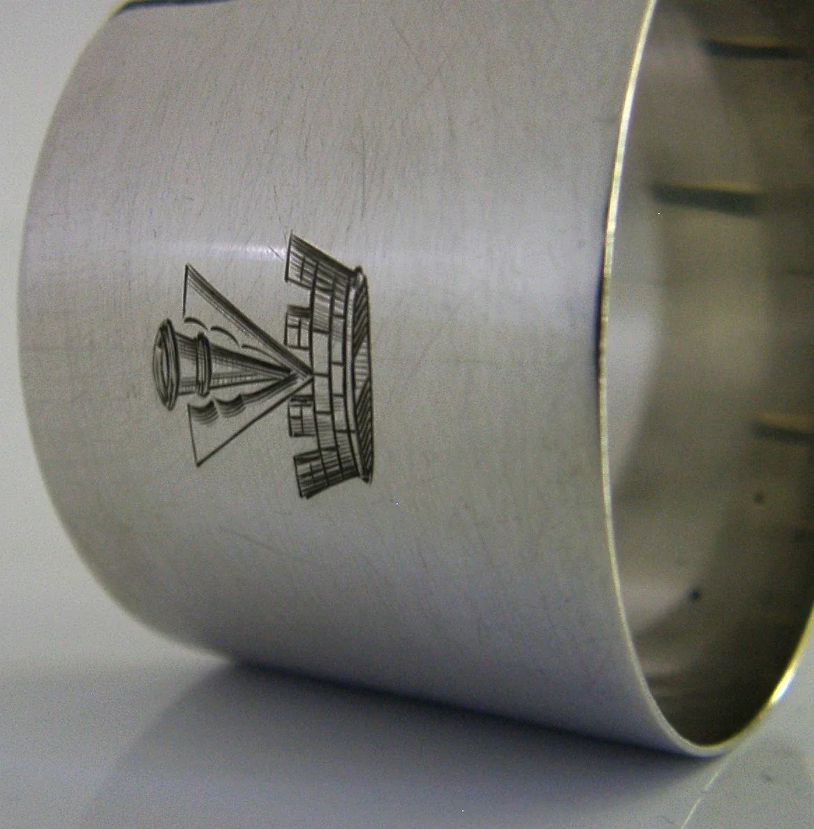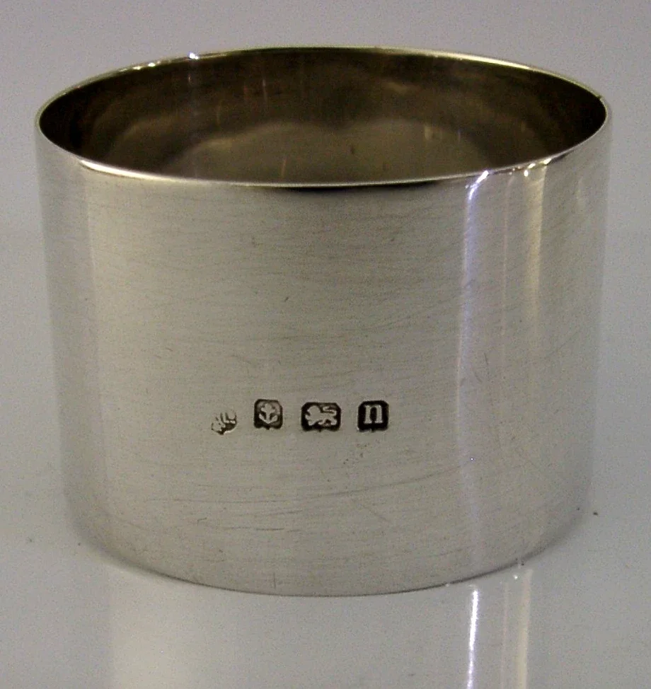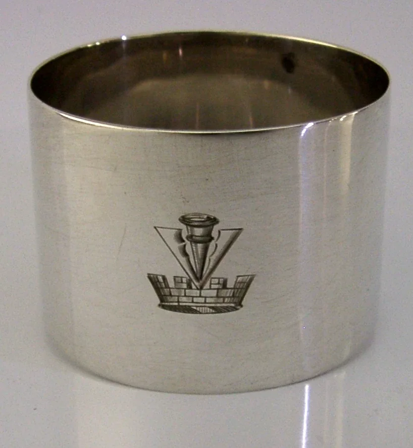 A superb English antique solid sterling silver napkin ring. It is hallmarked Birmingham 1912 with the maker being William Hutton & Sons Ltd. It has been superbly designed and has been engraved with a crest used by the Veevers Family. It is in superb condition being free from dings splits and repairs. It measures over 1.75 inches (4.7cm) across by 1.25 inches (3.4cm) tall and weighs 30 grams. A rare piece.