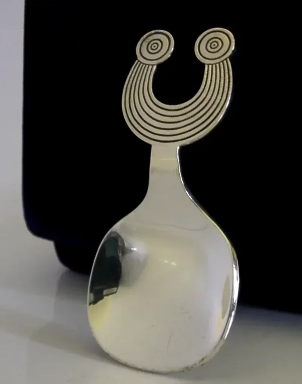A beautiful well made cased Irish solid sterling silver caddy spoon. It is hallmarked for Dublin 1973 with the makers marks being Thomas O'Connor & Sons Ltd. It has a very stylish design in the form of the Gleninsheen Collar. It is in super condition being free from dings splits and repairs. The case is also perfect. It measures over 3 inches (8cm) long by over 1.25 inches (3.6cm) wide and weighs 32 grams excluding the case. A very high quality beautiful piece.