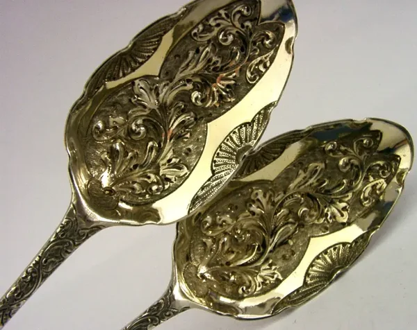 A stunning pair of English Georgian antique solid sterling silver berry serving spoons. They are hallmarked for London one dating 1791 and the other 1799 with the makers being Thomas Northcote and George Smith (IV). They have been superbly made being embossed with scrolled leaves. They are in superb condition being free from dings splits distortions and repairs. They measure over 8.5 inches (21.7cm) long by 1.75 inches (4.6cm) wide and weigh 114 grams. A super quality pair.