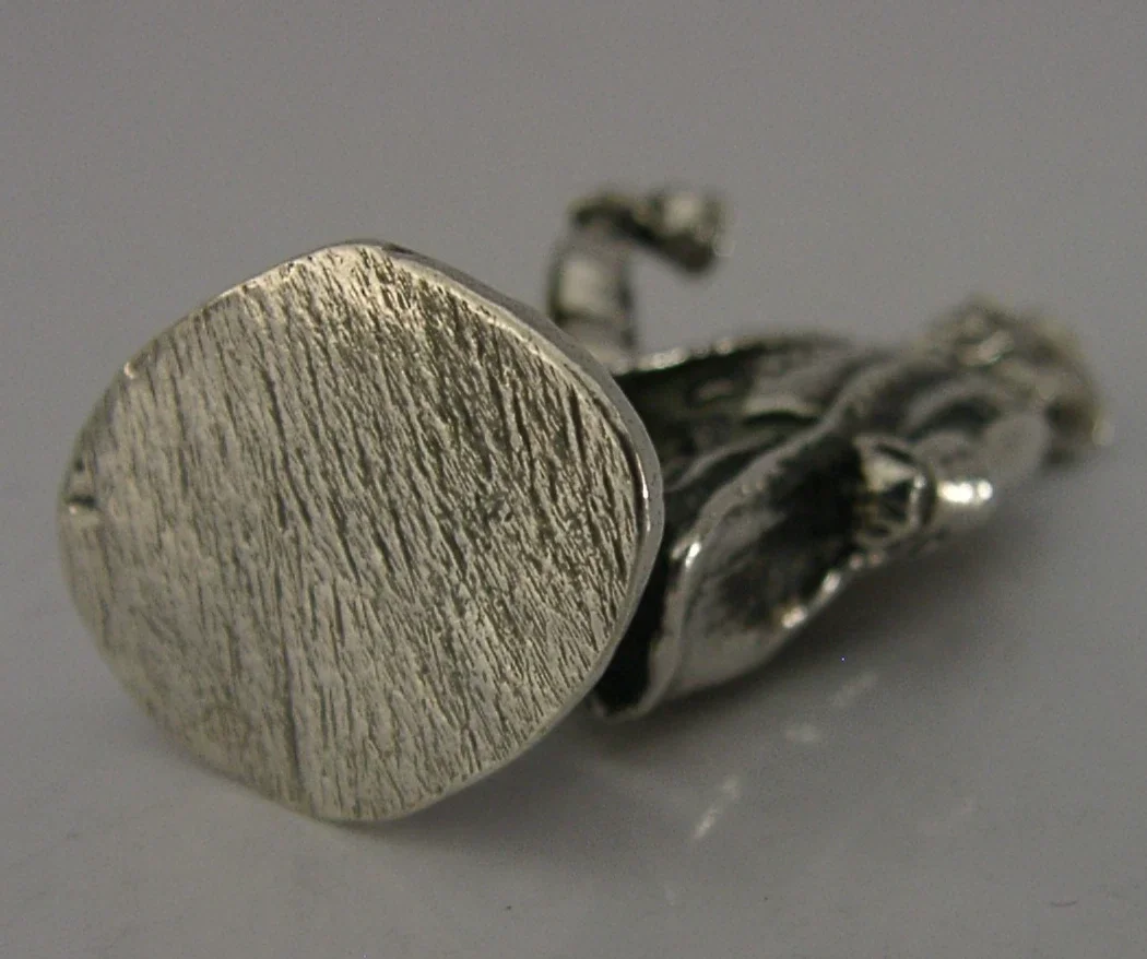 A quality English solid cast sterling silver figure. It is hallmarked for London 1978 with the maker being SMC. It has been superbly cast in the form of a Town Crier. It is in super condition being free from dings splits and repairs. It measures approx. 2 inches (5cm) tall by 1 inch (2.6cm) across the end and weighs 32 grams. A quality piece.