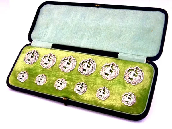 A rare very pretty cased set of 12 solid sterling silver buttons. They are all hallmarked for Birmingham 1900 with the maker being L&S. They have been beautifully made being decorated with classical figures and are in superb condition being free from dings splits and repairs. The case is also in great condition. The larger 6 measure 1a touch over 1 inch (2.8cms) across the smaller 0.75 inches and combined (all 12 buttons only) weigh 34 grams excluding the case. A super quality rare set.
