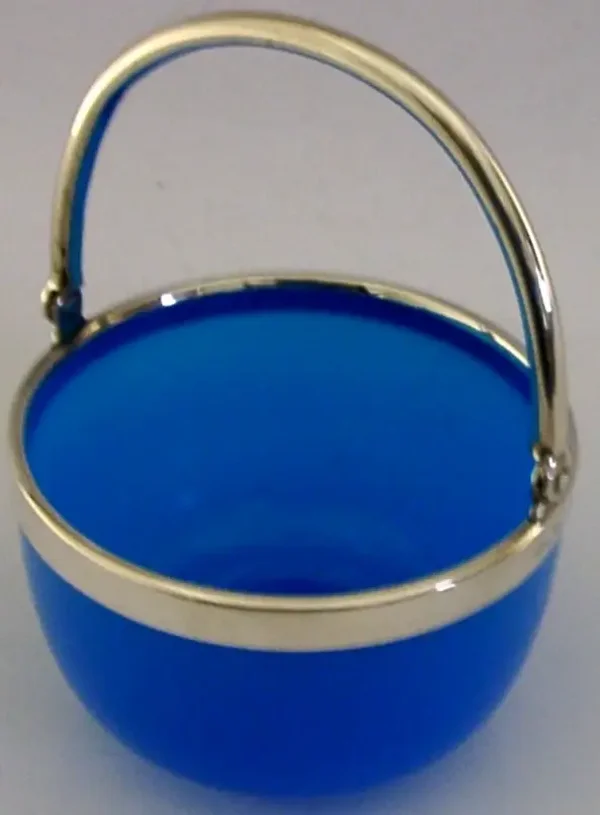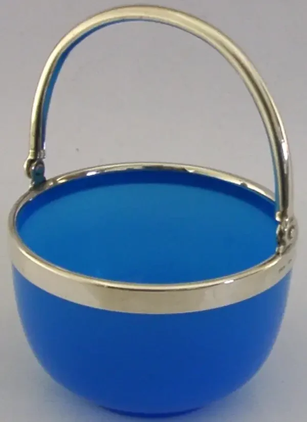 A very unusual Scandinavian mid century modern solid silver rimmed glass bowl. It is hallmarked 830S with the makers mark being HVH for Hans Vilhelm Hansen a Danish designer who operate from Copenhagen 1947-1973. It has a vibrant blie glass bowl and silver rim and handle. It is in super condition. The silver is free from dings splits repairs and dings. The glass is free from cracks chips and repairs. The handle is slightly out of shape. It is a good size measuring approx. 4.75 inches (12cm) wide across at its widest point by 6.25 inches tall to the top of the handle 3 inches to the rim. It weighs 330 grams. A beautifully made piece.