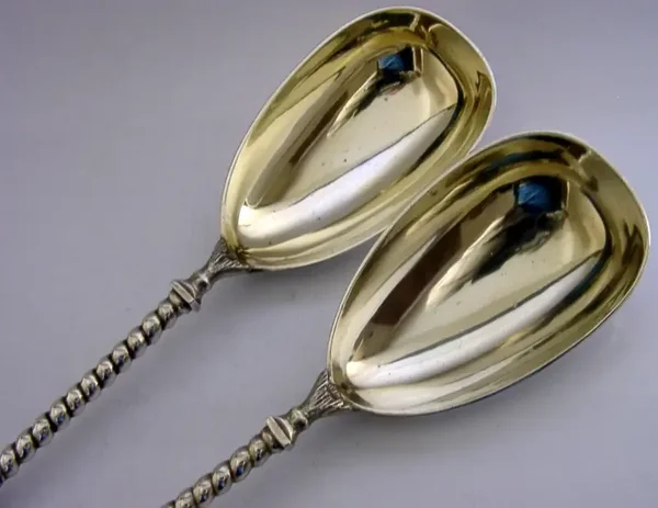 A superb set of English Victorian antique silver plated serving spoons. They are marked with the makers mark of William Hutton & Sons along with the Diamond / lozenge mark dating them to March 1873. They have been ornately designed having patriotic emblems to its terminal and are in superb condition being free from dings splits and repairs. They measures approx. 9 inches (23cm) long by 2 inches (5.1cm) wide and have a combined weight of 206 grams. A very nice quality set.