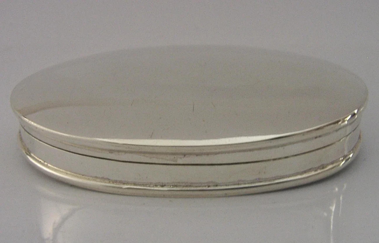A super quality solid sterling silver box. It is hallmarked for London 2000 with the marker being HJ. It has a stylish oval design and is in super condition being free from dings splits distortions and repairs. The hinge is smooth and tight. It measures approx. 2.75 inches (7cm) across by 1.75 inches (4.4cm) wide by 0.5 inch (1.2cm) tall and weighs 36 grams. A high quality example.