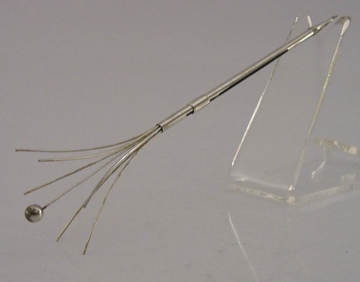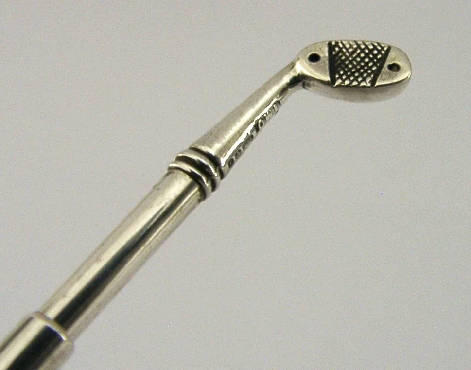 A superb English import solid sterling silver cocktail making / champagne mixing tool. It is hallmarked with English import marks for London 1983 with the importer being partially struck. It has been superbly designed being in the form of a golf club. It is in superb condition being free from dings splits distortions and repairs, it comes with a box. It measures approx. 3.75 inches (9.5cm) long and weighs 4 grams (excluding the box). A superb piece.