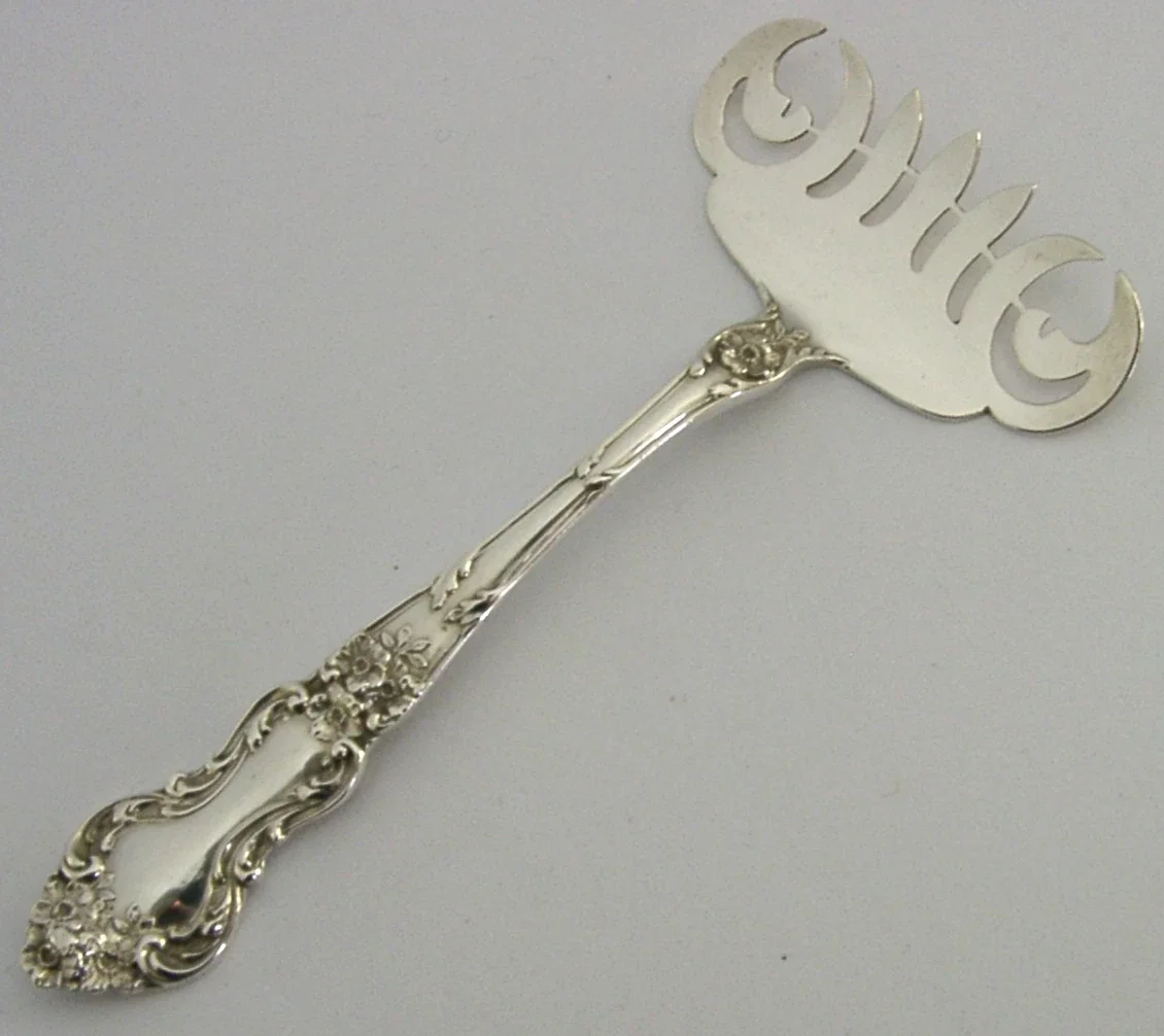 A beautiful American antique solid sterling silver sardine server. It is hallmarked STERLING along with a makers mark of Mechanics / Webster and dates to c1920-1040? It has been superbly designed and is in super condition being free from dings splits distortions and repairs. It measures approx. 5 inches (12.6cm) long by 2.25 inches (5.7cm) wide and weighs 24 grams. A beautifully made example.