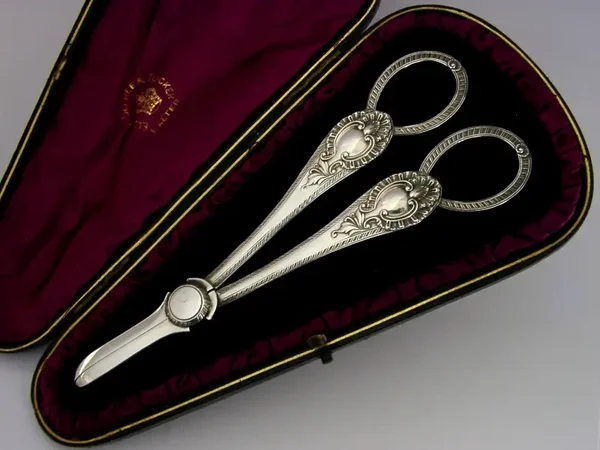 CASED SET of VICTORIAN ENGLISH STERLING SILVER GRAPE SHEARS 1883 ANTIQUE SUPERB