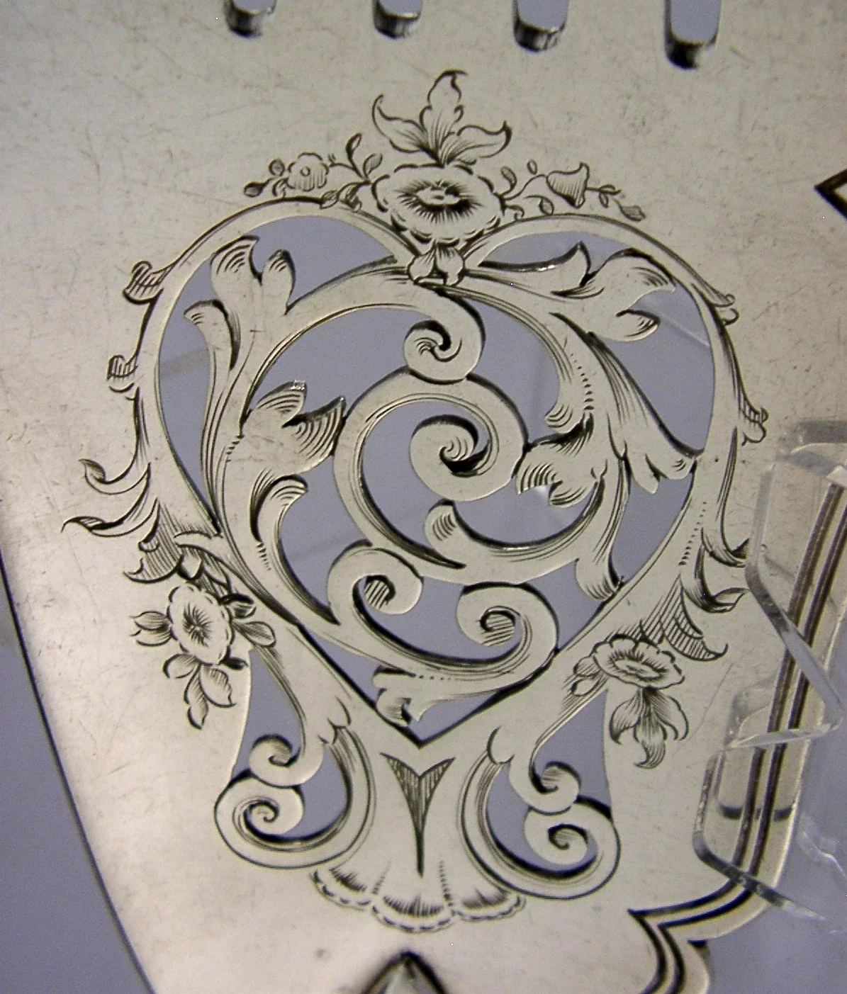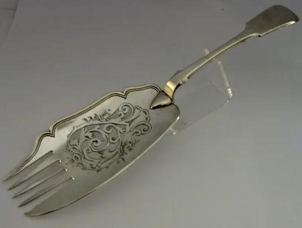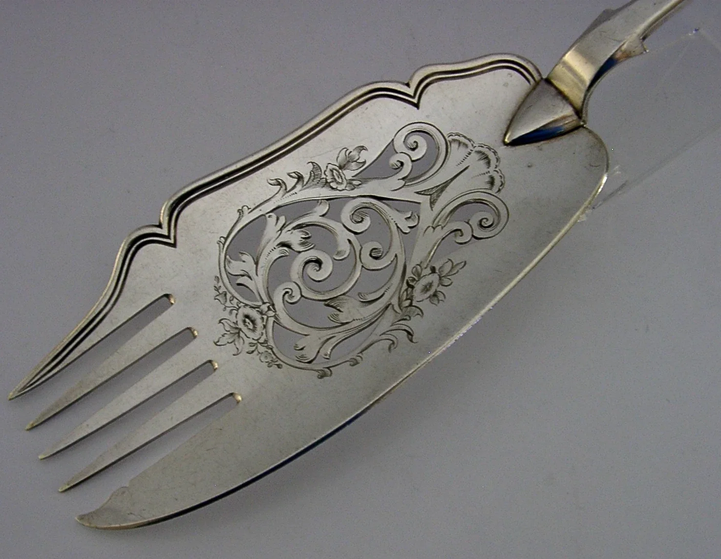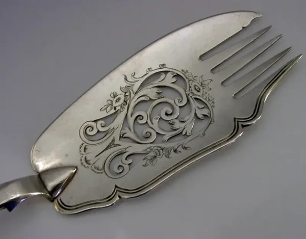 A superb English Victorian antique silver plated server. It is marked with the makers mark of Elkington, Mason & Co along with the date number 7 for 1847. It has been ornately designed and is in superb condition being free from dings splits and repairs. They measures approx. 11.5 inches (29.2cm) long by 2.75 inches (6.8cm) wide and weighs 138 grams. A very nice quality piece.