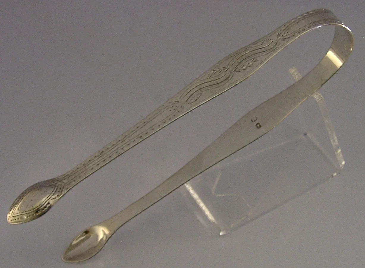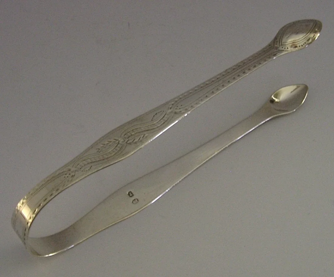 HESTER BATEMAN ANTIQUE STERLING SILVER BRIGHT CUT SUGAR TONGS c1780 GEORGIAN