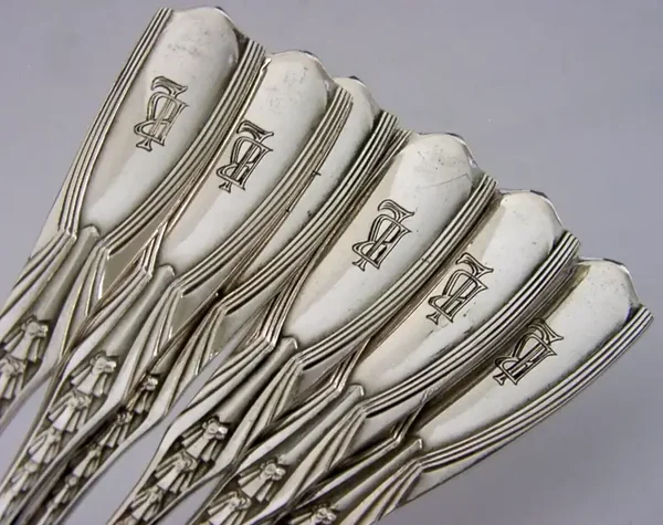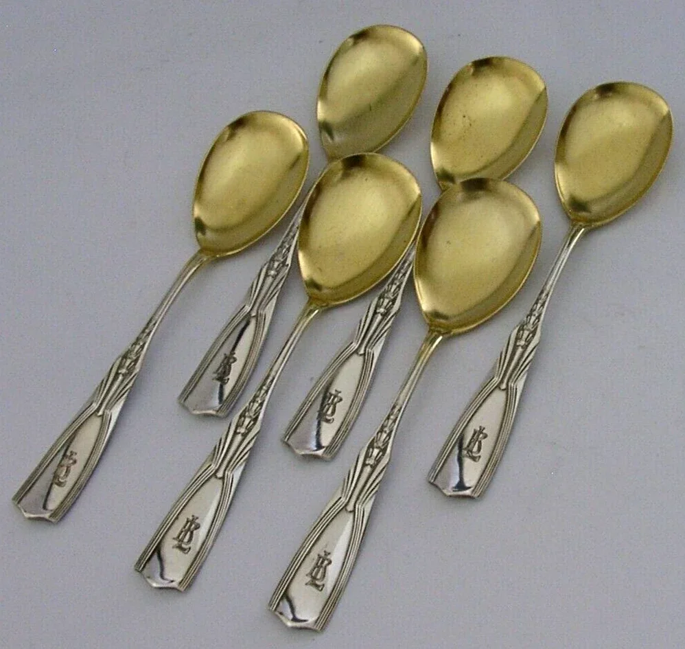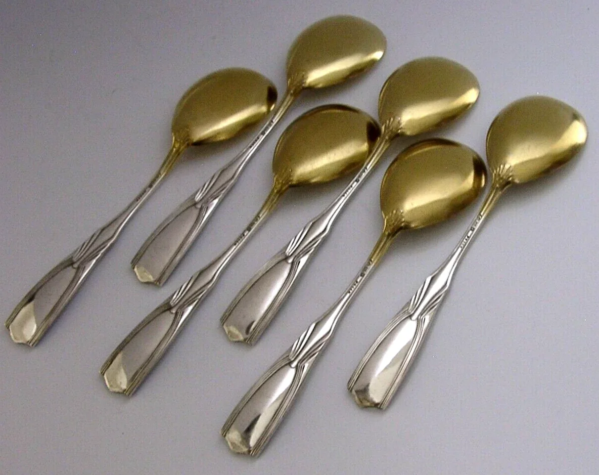 A superb heavy set of six German solid 800 silver ice cream spoons. They are all hallmarked with the 800 silver standard marks, the German state mark and the makers mark POSEN. I would date them to c1920-1940. They have a very stylish Art Deco design with gilded bowls and handles engraved LB or BL. They are in superb condition being free from dings and repairs. They measure approx. 5.5 inches (14cms) long by 1.5 inches (3.5cms) wide and combined weigh 150 grams. Beautifully made examples.