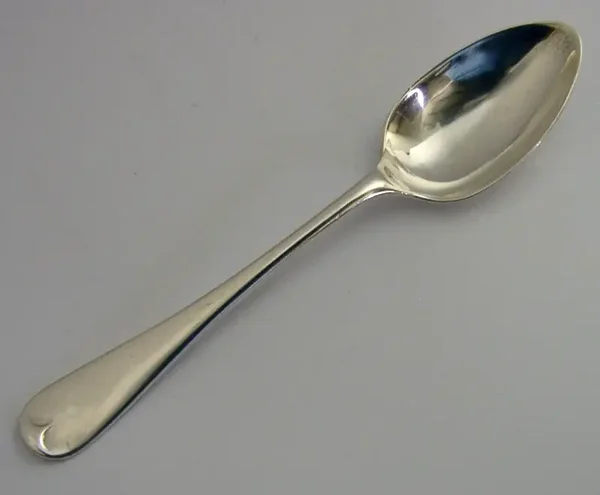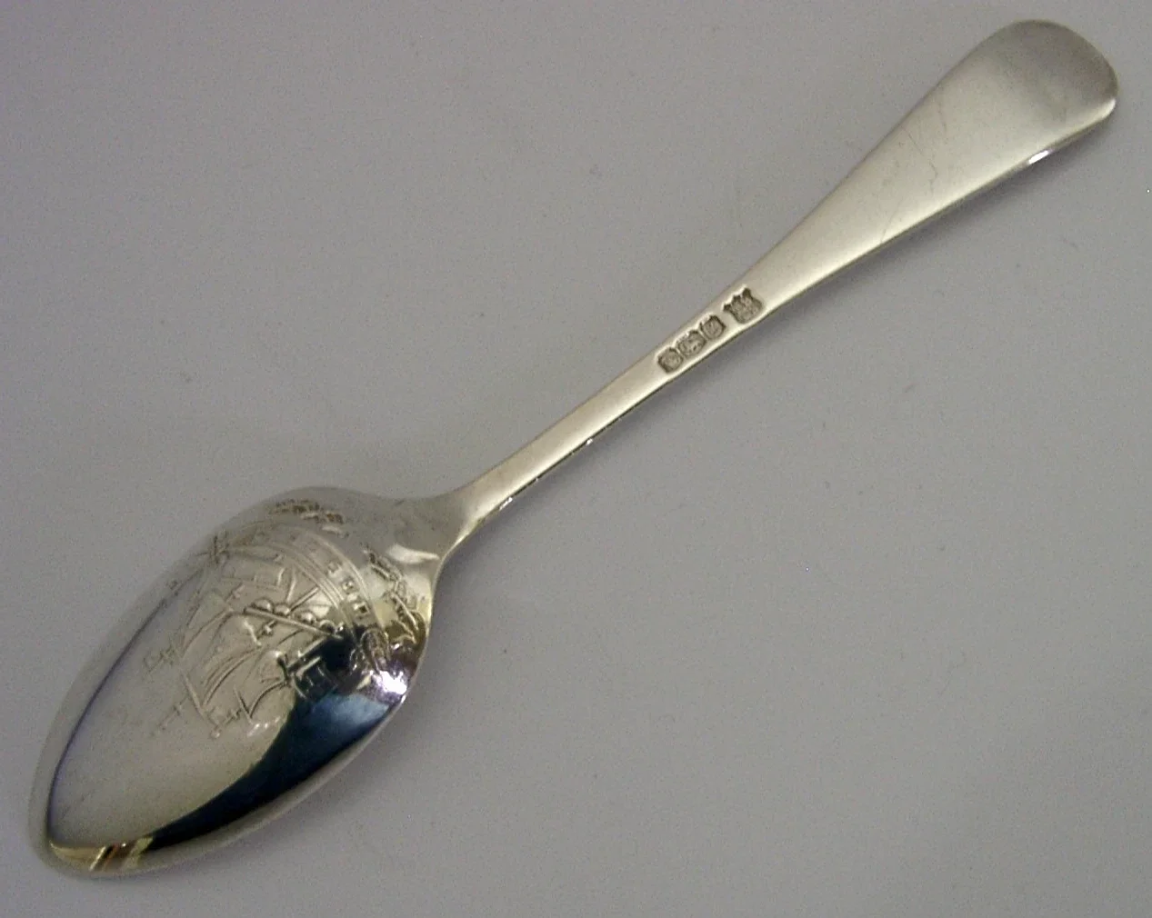 A very nice quality English solid sterling silver spoon. It is hallmarked for Sheffield 1924 with the maker being TB&S. It has been superbly designed with the bowl back being decorated with a tall sailing ship - a copy of an example from 100+ years previous. It is in super condition being free from dings splits distortions and repairs. It measures almost 4.5 inches (11cm) long and weighs 14 grams. A very nicely designed piece.