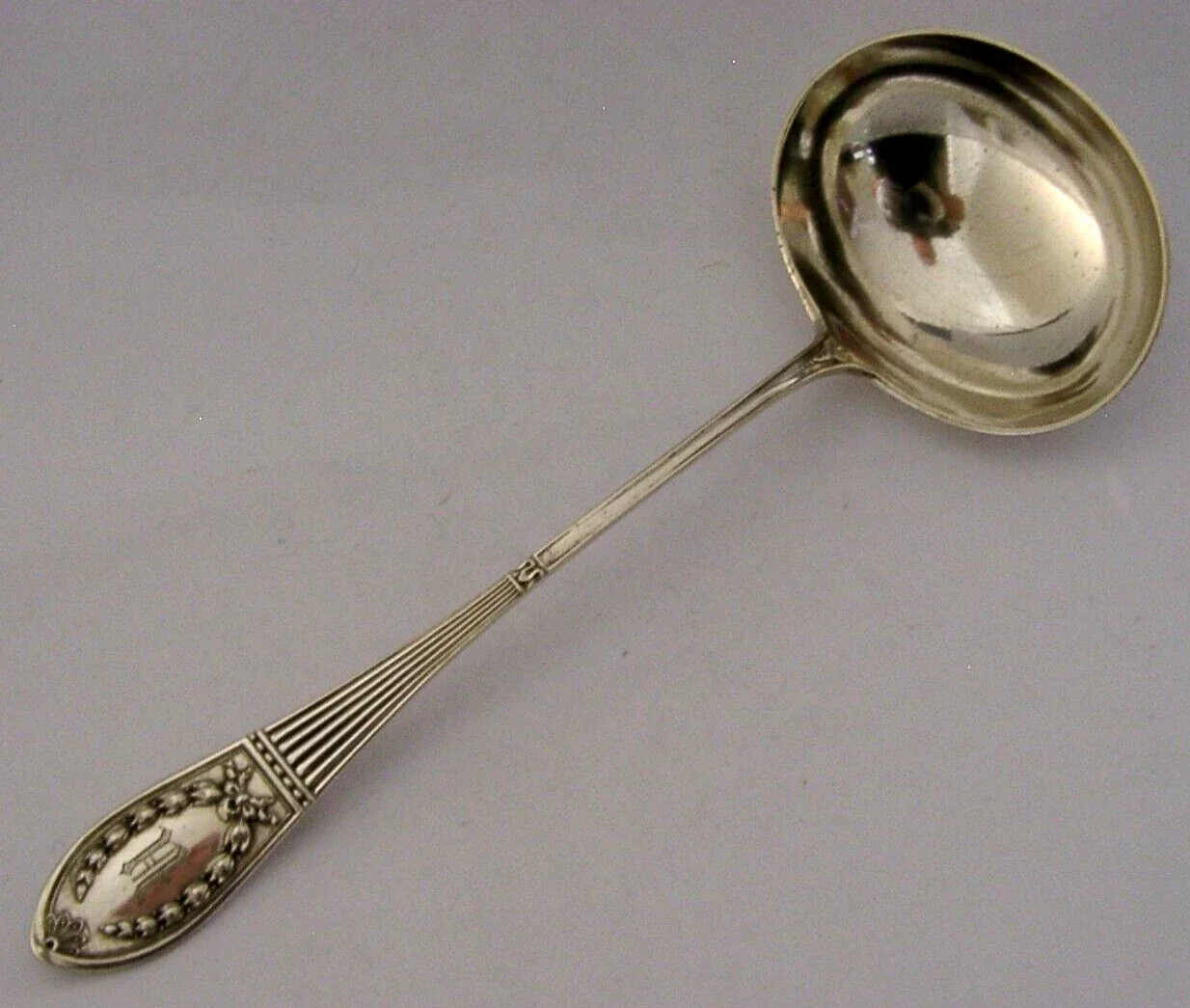 A beautiful German antique solid silver sauce ladle. It is hallmarked with the German crescent moon and crown mark, the 800 standard mark and the makers mark of Koch & Bergfeld who operated in Bremen from 1859. I would date it to c1910. It has been beautifully made and is in super condition being free from dings splits and repairs, engraved U. It measures approx. 7.5 inches (19cm) long by 2.5 inches (6.6cm) wide and weighs 64 grams. A very nice quality piece.