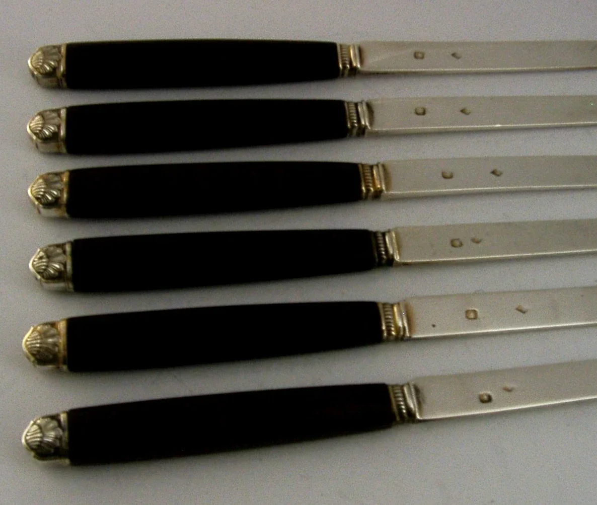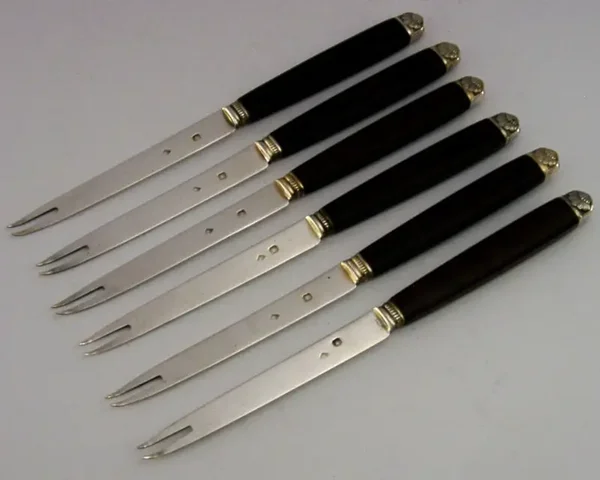 A beautiful rare cased set of six French solid sterling silver snail (escargot) eating forks / picks, for winkling snails from their shells, (note for ebay there are no shape edges just two prongs on each fork). They are hallmarked with the Minerva Head 950 silver mark and a makers mark. I would date them to c1940-1950. They have been beautifully made having wooden handles and are in superb condition being free from dings splits and repairs. The case has scuffs to its base - see photo). They measure approx. 6.25 inches (16cms) long and have a combined weight of 102 grams, excluding the case. A beautifully made rare set.